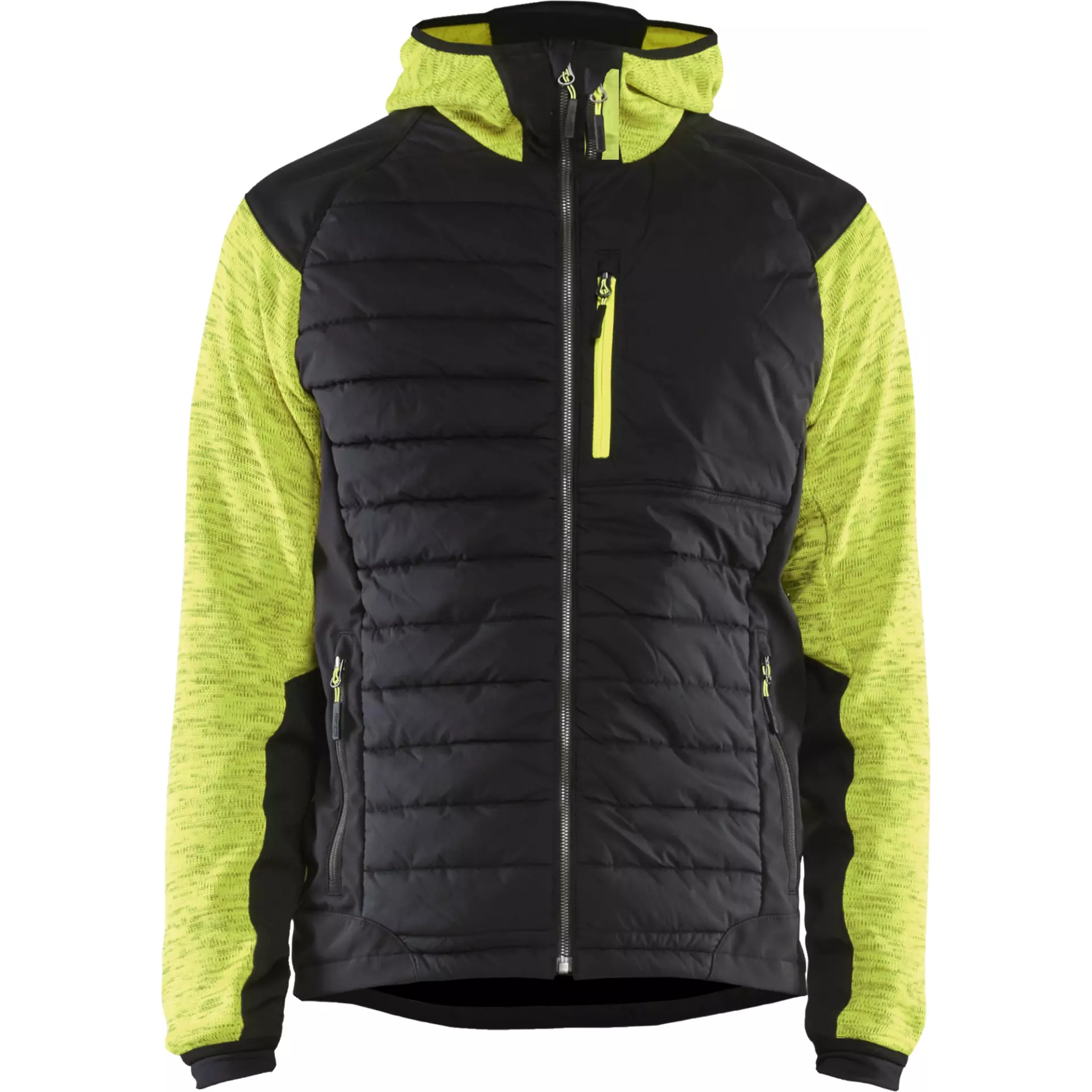 Diese Hybrid-Jacke kombiniert dünne, warme Polsterung an Vorder- und Rückseite sowie an der Kapuze mit Softshell-Material an Schultern, Armen und Seiten für optimale Bewegungsfreiheit. Das vielseitige Kleidungsstück eignet sich sowohl als Jacke als auch als Pullover und bietet durch die halbgefütterte Konstruktion mit gebürsteter Innenseite hervorragenden Komfort bei Arbeiten in kälteren Umgebungen. Mit Oeko-Tex Standard 100 Zertifizierung gewährleistet sie schadstoffgeprüfte Materialqualität.
