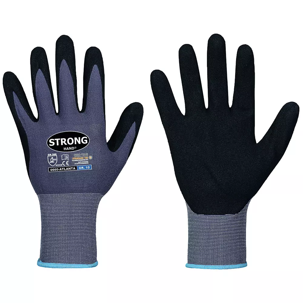 Norm: EN 388 Träger: 65% Polyamid, 35% Elasthan, Grau Beschichtung: Mikro-Nitrilschaum mit wasserbasiertem PU, Schwarz Größen: 6, 7, 8, 9, 10, 11 Feinstrick, nahtlos / 15 G • Standard 100 by Oeko Tex®, Zert.-Nr. 15.0.69098