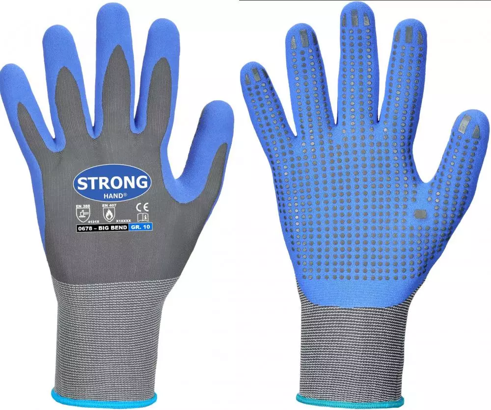 Norm: EN 388, EN 407 Träger: 65% Polyamid (Nylon), 35% Elastan, Grau Beschichtung: Mikro-Nitrilschaum, Sandy-Finish, Blau und Nitril-Noppen, Grau Größen: 6, 7, 8, 9, 10, 11 Nahtlos gestrickt / 15 G • Hitzebeständigkeit: Stufe 1 Kontaktwärme gem. EN 407