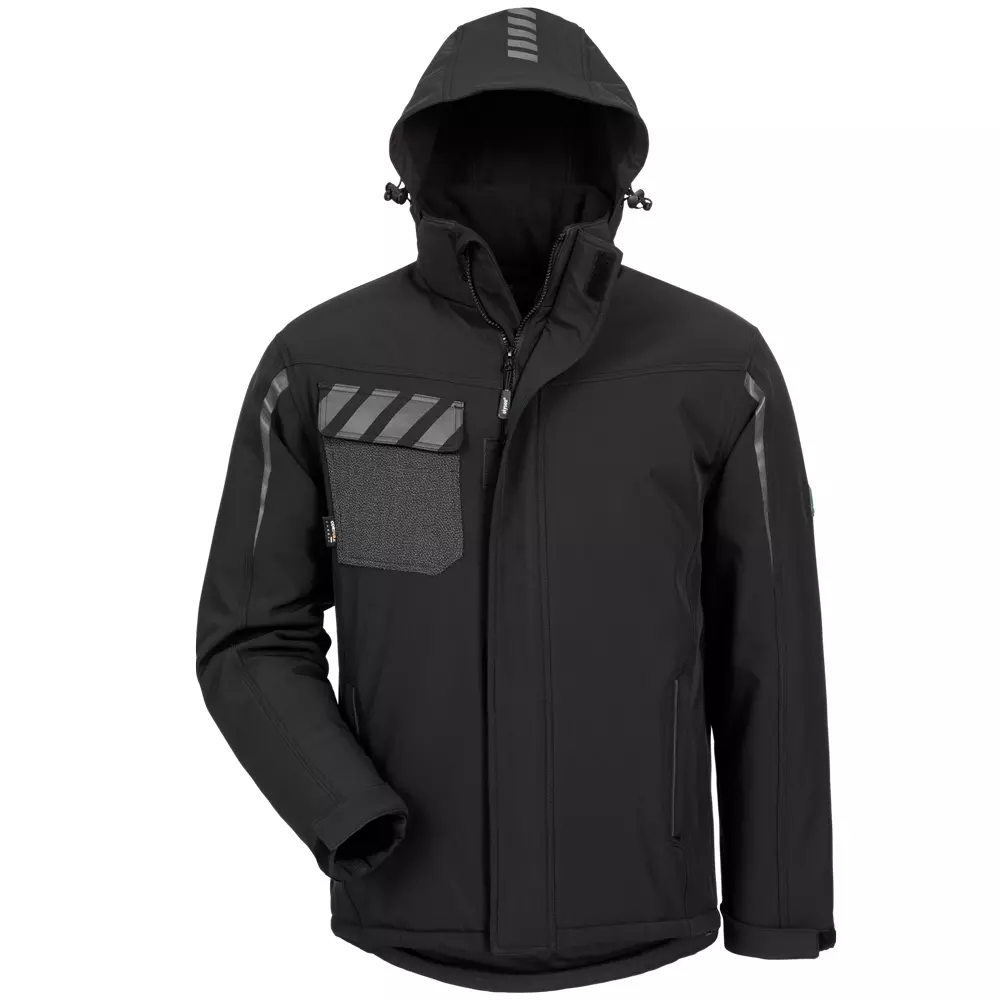 Obermaterial: 100% Polyester, 3-Lagen-Laminat (Softshell) Atmungsaktivität: 1.000 g/m²/24h Wassersäule: 5.000 mm Verstärkung: 100% Polyamid (Cordura®) Futter: 100% Polyester Wattierung: 100% Polyester Farbe: Schwarz Größen: S - 4XL Extra robuste Brusttasche aus Cordura