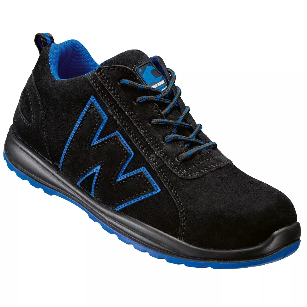 EN ISO 20345 S1P SRA Farbe: Schwarz/Blau Weite: 10,5 Größe: 36-47 Verpackungseinheit: 10 Paar Obermaterial aus schwarzem Veloursleder • Ergonomisch geformter, gepolsterter Schaftrand • Gepolsterte Staublasche • Verschluss durch Ösen und Rundsenkel