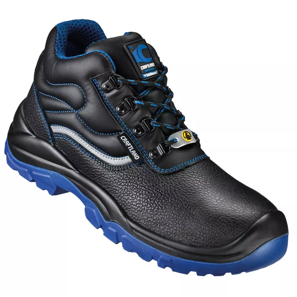 Norm: EN ISO 20345 S3 FO SR ESD Farbe: Schwarz/Blau Weite: 10,5 Größe: 36–48 Verpackungseinheit: 10 Paar Obermaterial aus leicht geprägtem Leder • Gepolsterte Staublasche • Ergonomisch geformter, gepolsterter Schaftrand • Triangel-Ösen und Rundsenkel