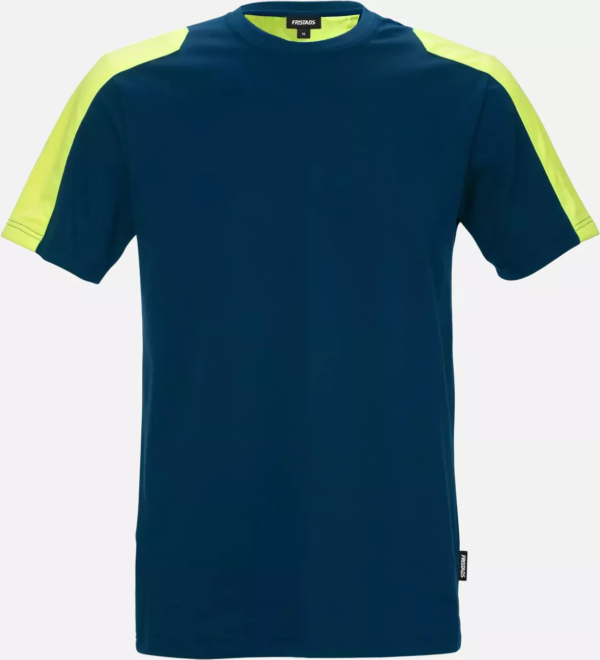 Schweres Stretch-T-Shirt mit neongelben Einsätzen an Schultern und Ärmeln für erhöhte Sichtbarkeit. Das Shirt verfügt über einen Rippstrick-Rundhalsausschnitt und Kontrastnähte für zusätzliche Strapazierfähigkeit. Mit OEKO-TEX® Zertifizierung gewährleistet es schadstoffgeprüfte Textilqualität.