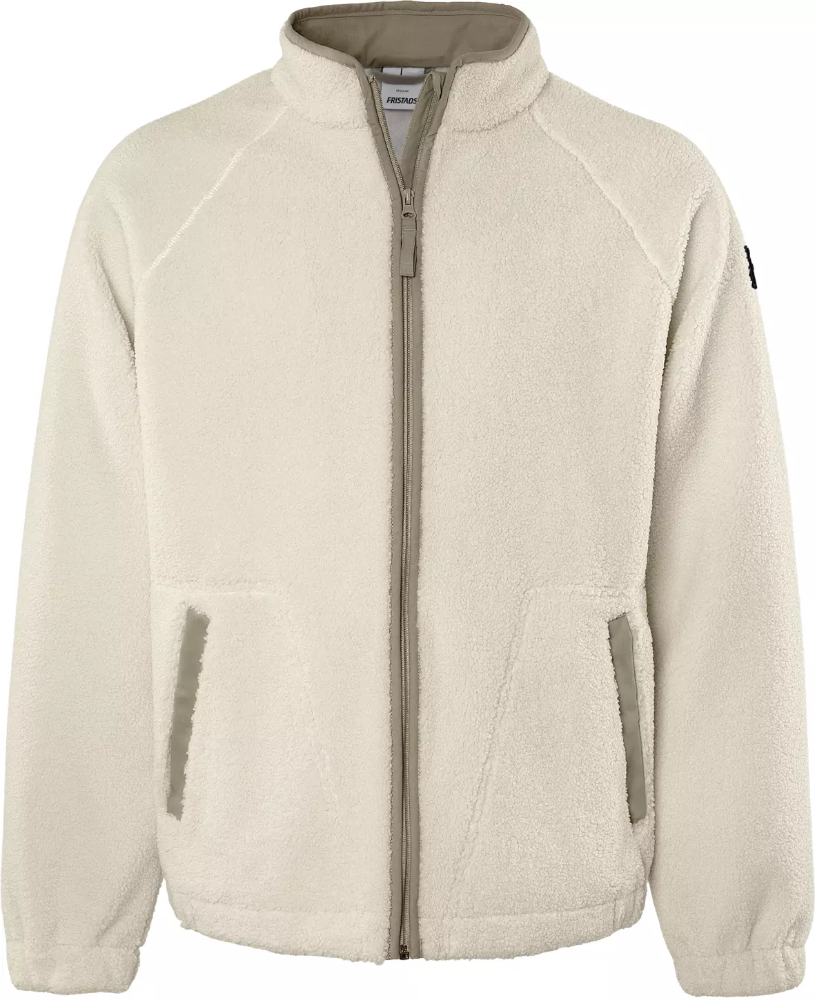 - Baumwolleinfassung am Kragen, Frontreißverschluss, Fronttaschen, Ärmelinnenseiten und Saum