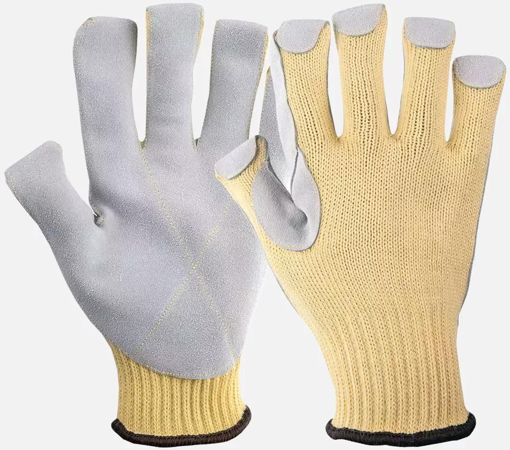 Schnittfester Montagehandschuh aus Para-Aramid mit Spaltlederbesatz an Handinnenfläche, Fingerkuppen und Daumenbeuge, leichter Kontakthitzeschutz, Leistungsstufe D. EN 388, EN 407