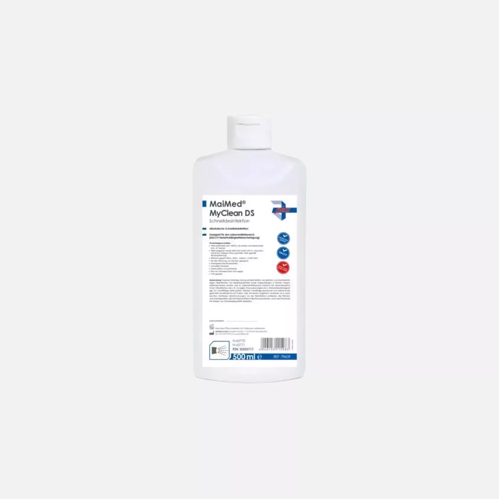 Alkoholische Schnelldesinfektion Geeignet für den Lebensmittelbereich (HACCP-Verkehrsfähigkeitsbescheinigung) Wirkt bakterizid (inkl. MRSA), levurozid und tuberkulozid (inkl. M.-terrae) Wirkt begrenzt viruzid PLUS (HBV/HIV, BVDV (HCV), Vaccinia-, Influenza-/Grippe-Viren) (behüllte Viren gemäß RKI-Empfehlung) Wirksam gegen Noro-, Rota-, Adeno- und Corona-Viren (SARS-CoV-2 + VOC) Für die Tränkung von Tüchern geeignet Praxisgerechte Einwirkzeiten Schnelles Trocknen Aldehy-, QAV- und rückstandsfrei VAH-gelistet Gebrauchsfertige Lösung zur Desinfektion von alkohol- und wischbeständigen Oberflächen von Medizinprodukten sowie Gegenständen in Kliniken, Praxen, patientennahem Umfeld und im Lebensmittelbereich (Vorsicht bei alkoholempfindlichen Oberflächen wie z. B. Acrylglas, Poly- carbonatglas etc.). Materialbeständigkeit ggf. an unauffälliger Stelle prüfen. Flächen vollständig abwischen und während der gesamten Einwirkzeit feucht halten. Ggf. mit einem hygienisch sauberen Tuch nach- wischen. Sichtbare Verschmutzungen vor der Desinfektion entfernen. Bei Flächen und Arbeitsgeräten, die mit Lebensmitteln in Berührung kommen, ist kein Abspülen/Nachwischen erforderlich. 100 g Lösung enthalten: Wirkstoffe: 50 g Ethanol MPG, Richtlinie 93/42/EWG,VAH, HACCP CE-Kennzeichnung auf allen Verpackungsstufen CE-Klassifizierung: Klasse IIa