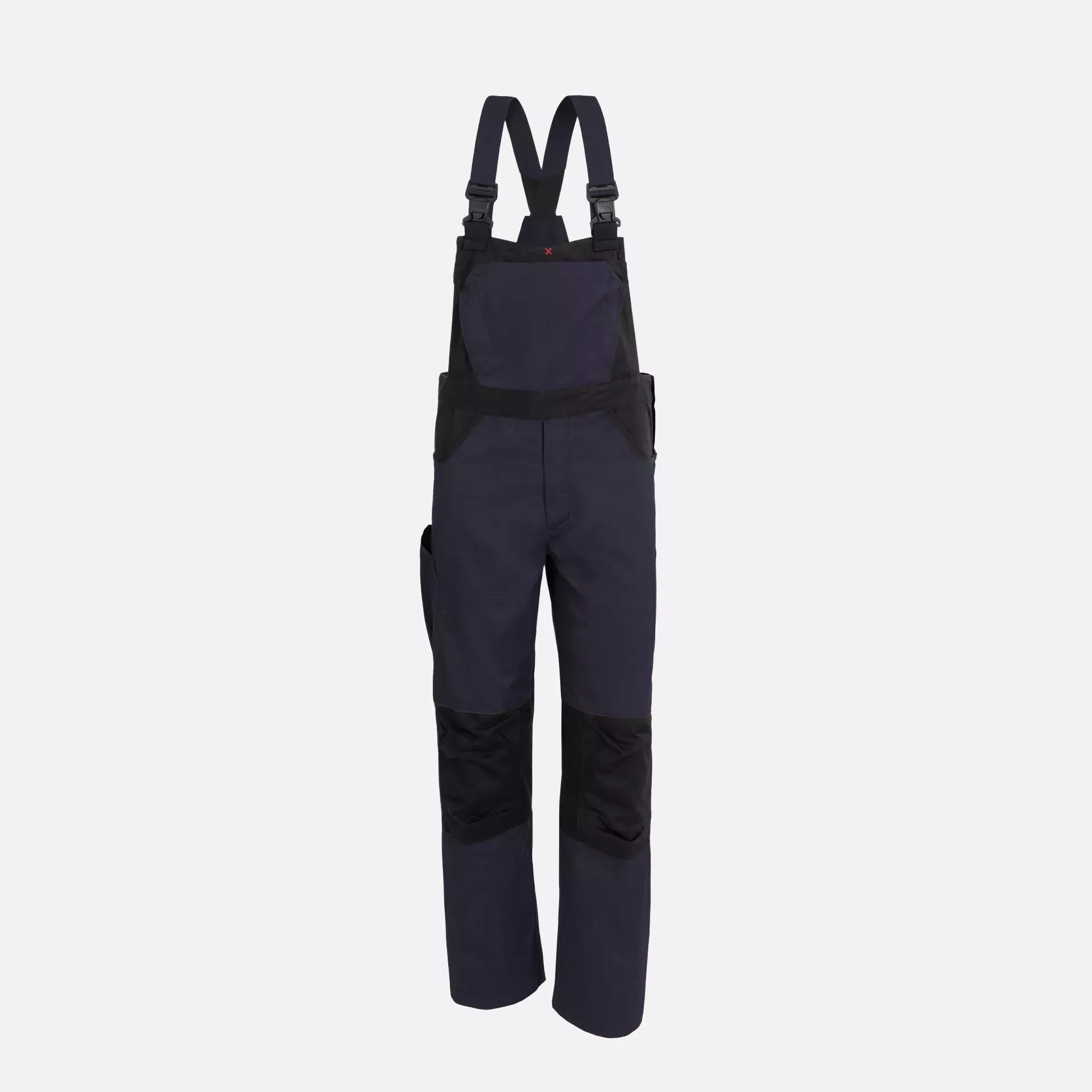 Einfacher Brustlatz mit aufgesetzter Latztasche, verschließbar mit innenliegendem Kst-Reißverschluss, zusätzliche Abtrennung für Stiftfach auf beiden Seiten, Werkzeugeinschub rechts und unter linkem Träger Eingriffstasche, Stoffträger mit elastischem Zwischenteil und Sicherheitsschnalle, Linksseitiger Durchgriff mit 2 übereinanderliegenden PES-Knöpfen, Rückseitiger Bund, weitenverstellbar über innenliegenden Gummizug, 2 eingesetzte Vordertaschen, die bis ins Rückenteil verlaufen, durch Seitennaht abgetrennt sind: dadurch rechts große Gesäßtasche bis zur Gesäßnaht und links kleinere Tasche Hosenschlitz mit Kst-Reißverschluss, Rechts 1 Maßstabtasche mit Abtrennung für Stiftfach, Links 1 aufgesetzte Oberschenkeltasche (ohne Verschluss), X-Riegel teilweise in Rot, teils Ton-in Ton, Vorgeformte Kniepolstertasche, Einschub der Kniepolster von unten, Hochgezogenes X-Rückenteil