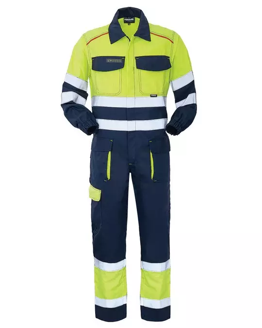 Professioneller Schutzoverall, konzipiert für verbesserte Sichtbarkeit und Funktionalität. Dieser langlebige Overall verfügt über mehrere sichere Aufbewahrungsmöglichkeiten mit Klettverschlusstaschen, strategische Reflexelemente und elastische Komponenten für verbesserten Komfort und Passform. Das Kleidungsstück enthält leitfähige Fasern und eignet sich daher für Umgebungen, in denen Schutz vor elektrostatischer Entladung erforderlich ist.
