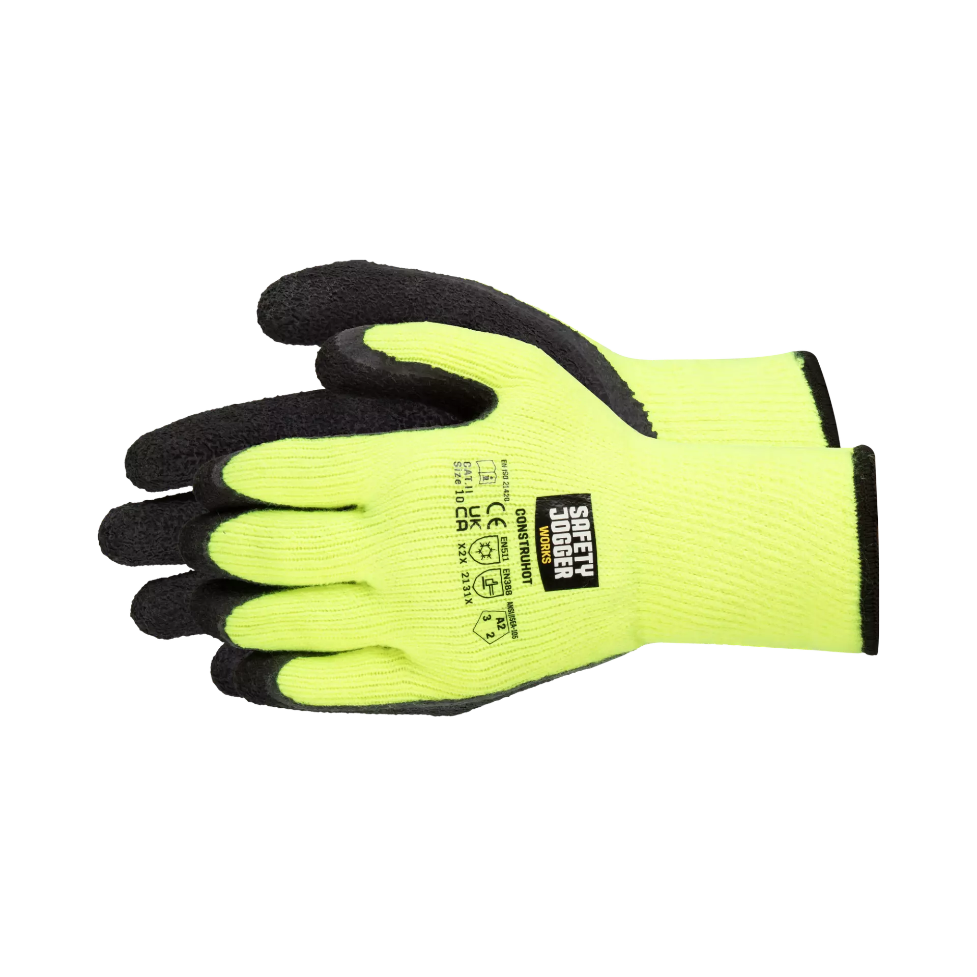 Die nahtlosen CONSTRUHOT Handschuhe sind für anspruchsvolle Arbeitsumgebungen konzipiert, in denen sowohl Schutz als auch Sichtbarkeit unerlässlich sind. Diese Handschuhe verfügen über ein Polyesterfutter mit einer schweren schwarzen Latex-Beschichtung, die Haltbarkeit und Griffigkeit unter schwierigen Bedingungen bietet. Die markante gelbe Warnfarbe verbessert die Sichtbarkeit und macht sie ideal für risikoreiche Umgebungen, während das dicke Futter für hervorragende Wärme und Kälteschutz sorgt.