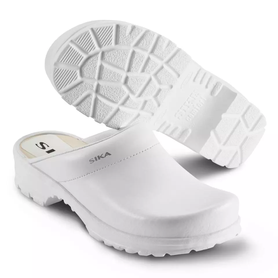 Robuster Clog mit breiter Passform und Fußbett aus Holz. Erhältlich in den Farben Schwarz und Weiß