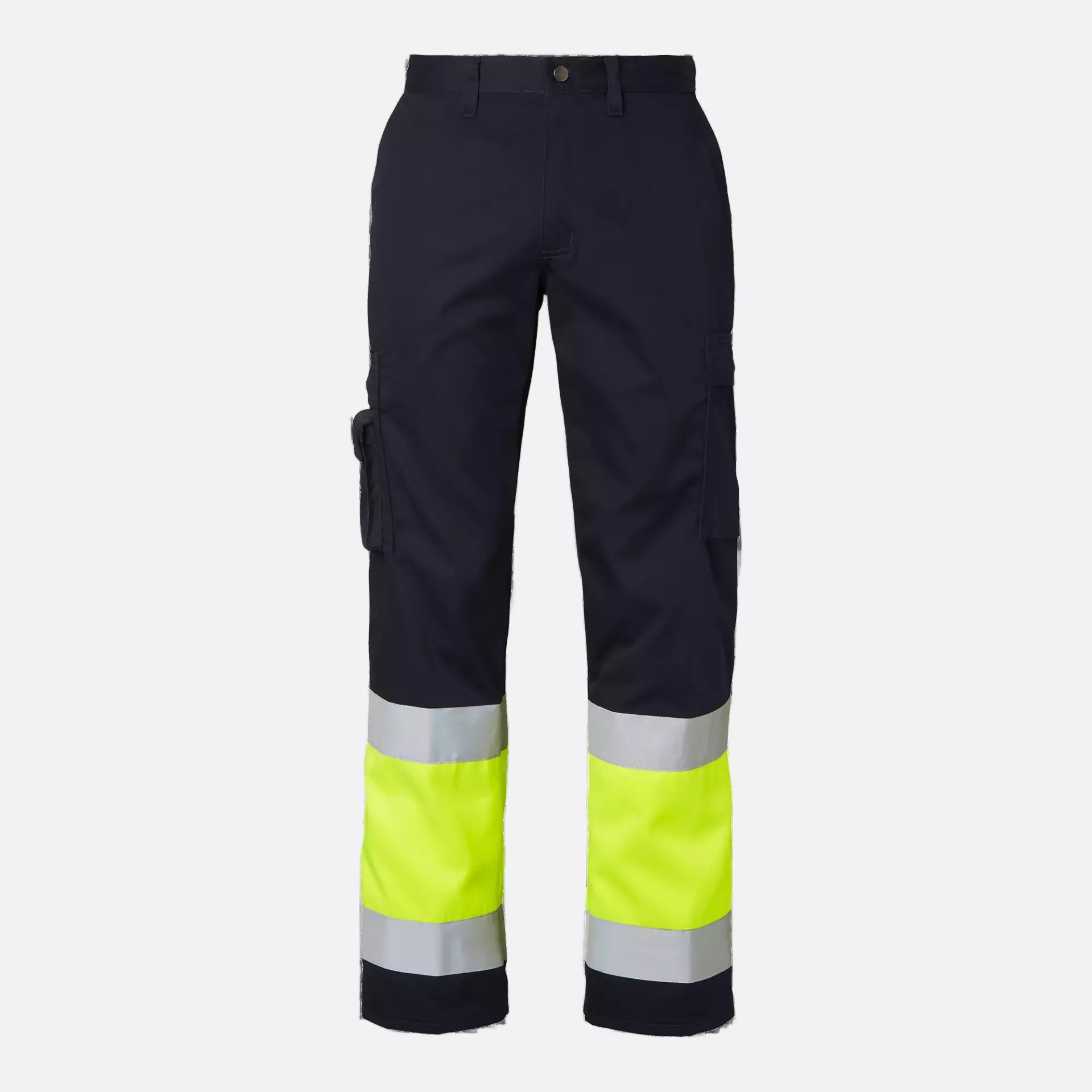 Professionelle Servicehose für Bau- und Industrieanwendungen mit umfassender Taschenorganisation und Hochsichtbarkeits-Klassifizierung. Diese Bundhose kombiniert ein strapazierfähiges Mischgewebe aus 65 % Polyester und 35 % Baumwolle mit verstärkter Konstruktion für anspruchsvolle Arbeitsumgebungen. Das Kleidungsstück erfüllt die Norm EN ISO 20471 Klasse 1 für Warnschutz und verfügt über die OEKO-Tex Zertifizierung SE 23-308.