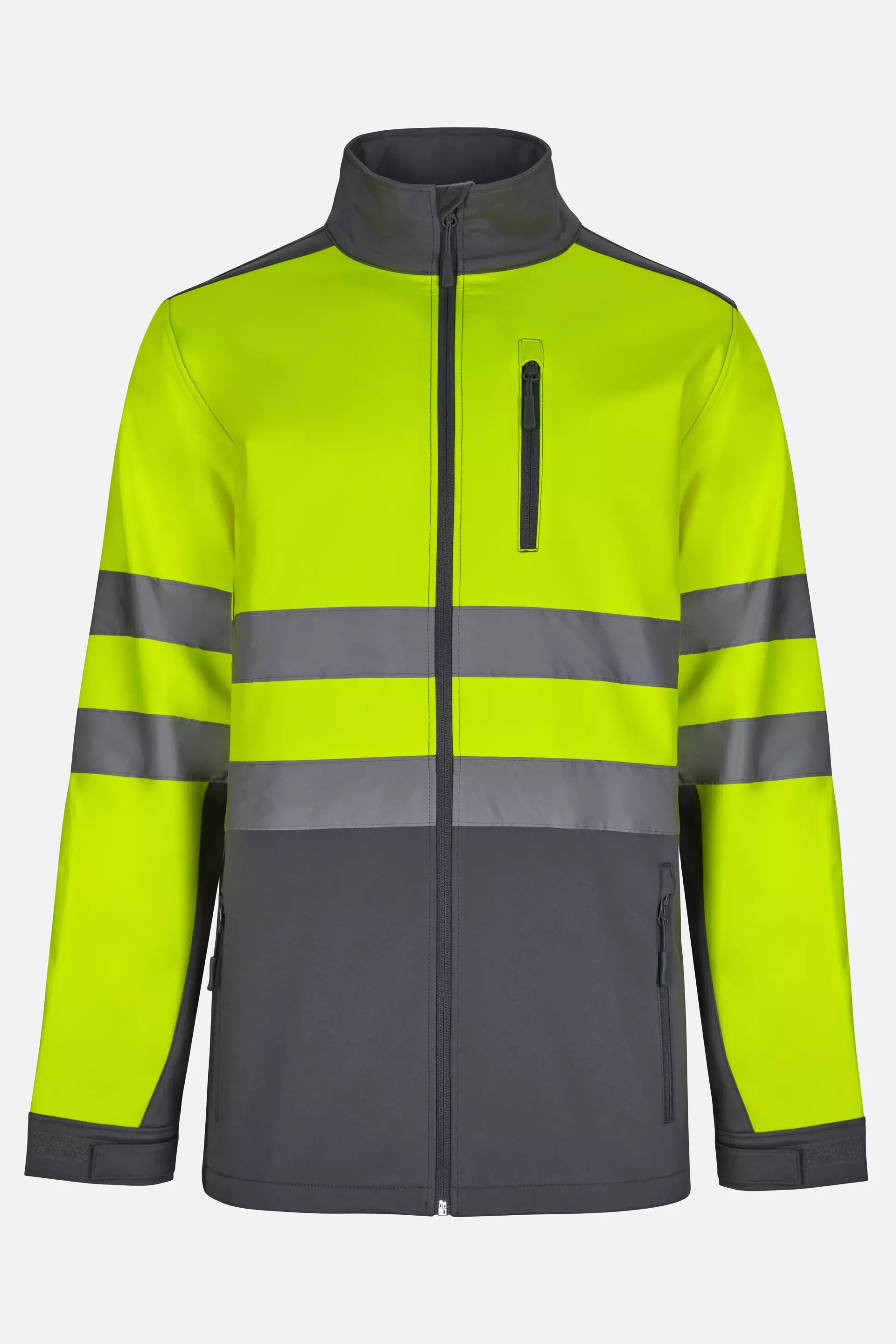 Diese Softshell-Jacke verfügt über eine dreilagige Stoffkonstruktion aus 96% Polyester und 4% Elastan für Flexibilität und Langlebigkeit. Das Design umfasst Reflexstreifen an Torso und Ärmeln für bessere Sichtbarkeit sowie mehrere Aufbewahrungsmöglichkeiten durch fünf strategisch platzierte Taschen. Praktische Elemente wie verstellbare Klettverschluss-Ärmelabschlüsse und verdeckte Reißverschlüsse bieten erhöhte Funktionalität und Wetterschutz.