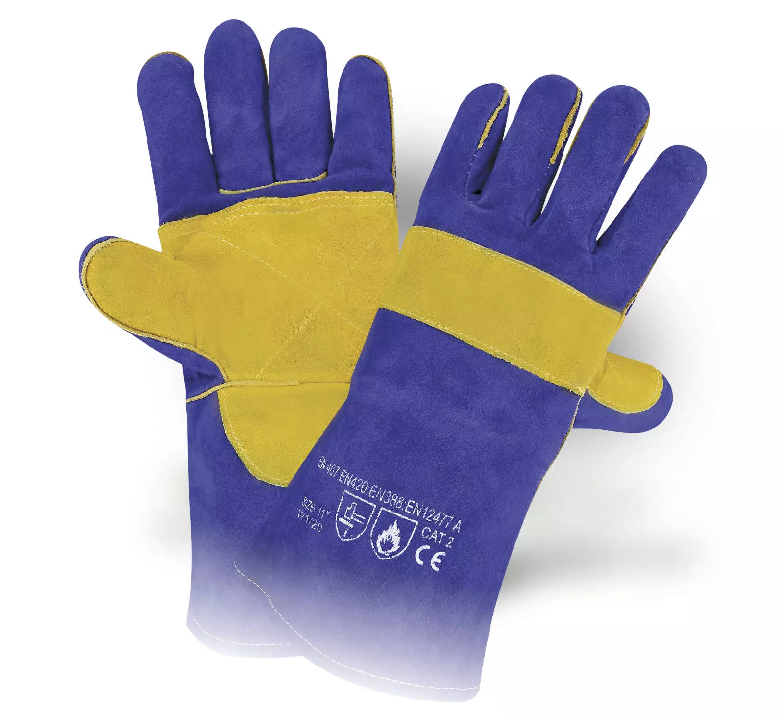 Schweißer-Schutzhandschuhe - Leder, robustes Spaltleder, blau, mit Wachs imprägniert, verdeckte Kevlar-Nähte, blaues Spaltleder, doppelte Handfläche und Daumen, Länge 35 cm, Futter aus Baumwolltextil