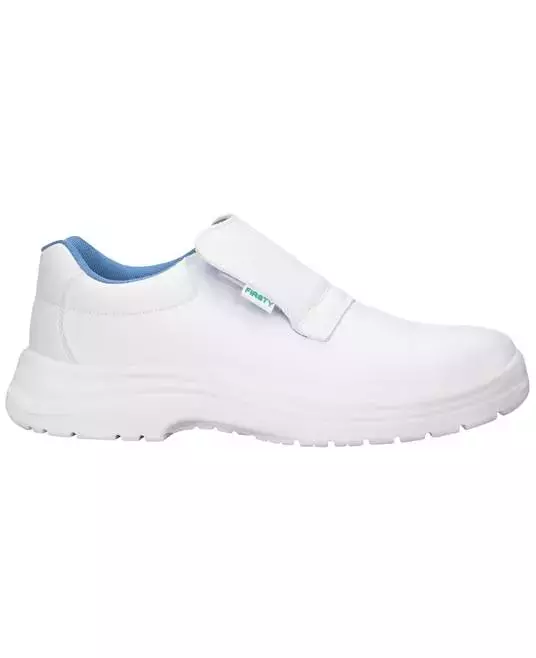 Provides protection from 200-joule impact with a protective toe cap, a closed heel, and antistatic properties. The heel absorbs energy and the upper part of the shoe is resistant to water penetration and absorption.