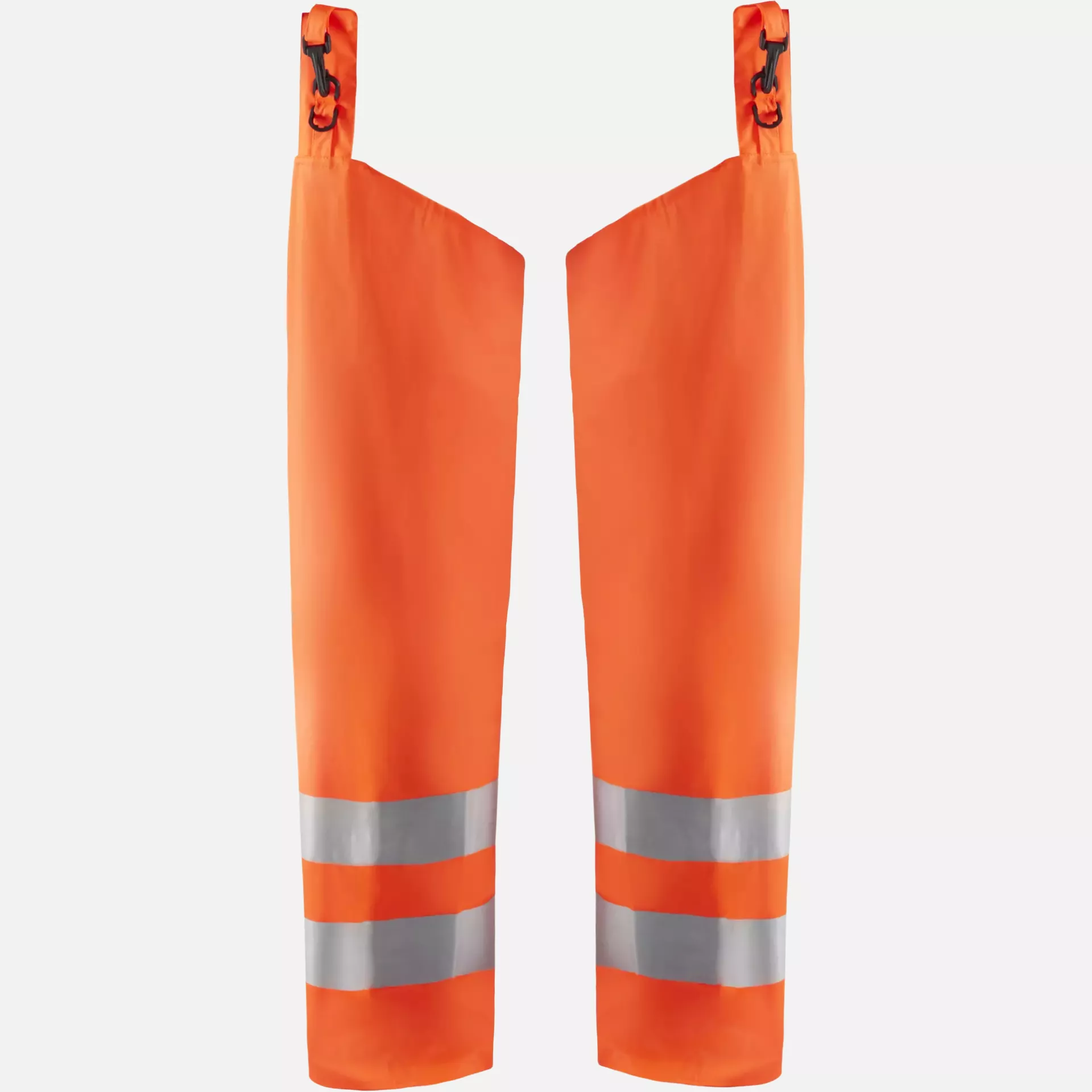 These High-Vis chaps offer wind and waterproof protection with welded seams for work tasks requiring lightweight rain gear. With a practical carabiner hook for attachment to the belt and adjustable length via hooks at the hem, they are specially designed for craftsmen as well as road and construction workers. The unlined construction made of PU-coated polyester ensures optimal freedom of movement while providing high visibility according to EN ISO 20471 Class 2.