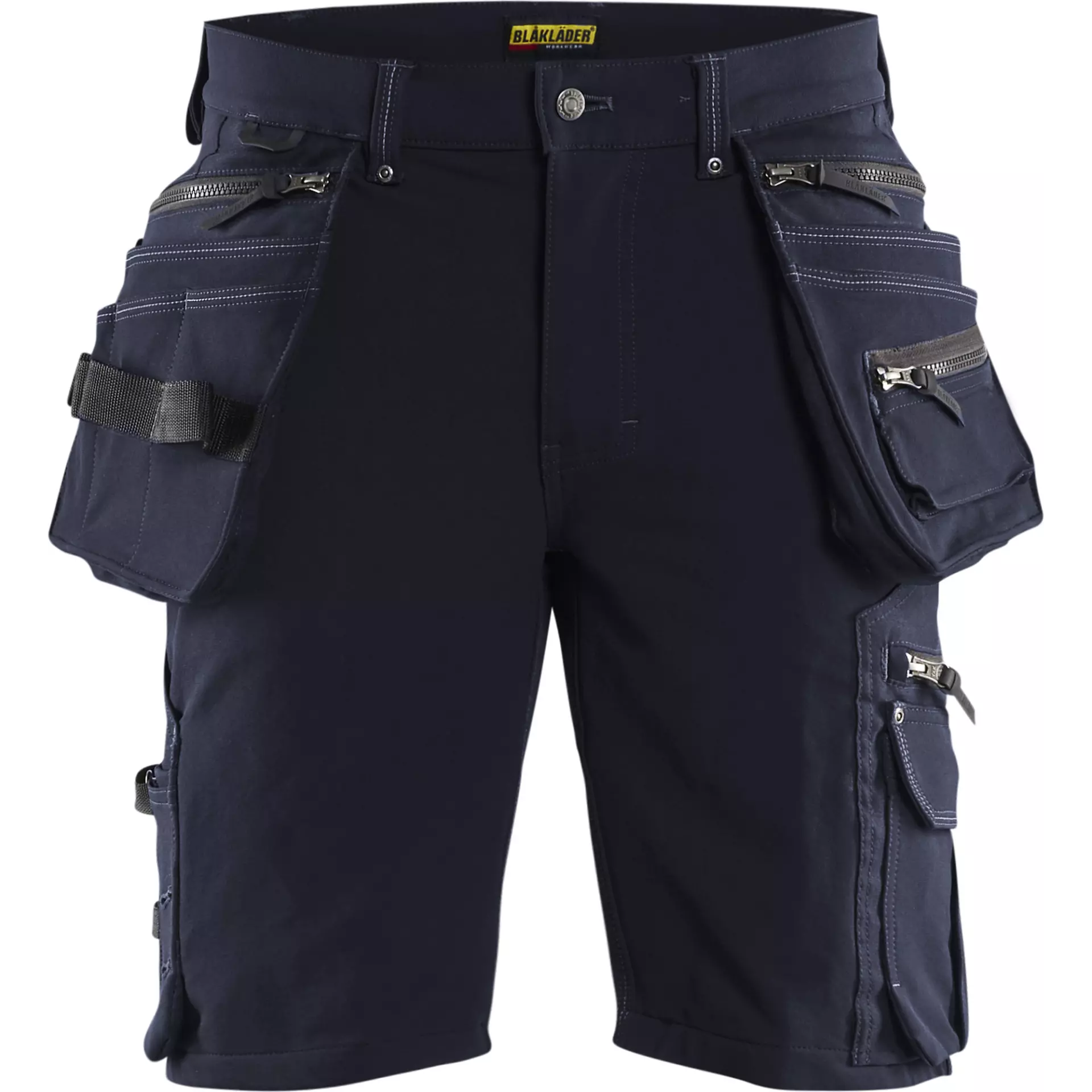 Craftsman shorts with robust 4-way stretch in a slim fit, based on Blaklader's trousers 1998. This shorts variant features extensive tool pockets, nail pockets, and practical details for professional trade work. The durable material made of polyamide and elastane offers optimal freedom of movement combined with high resistance.