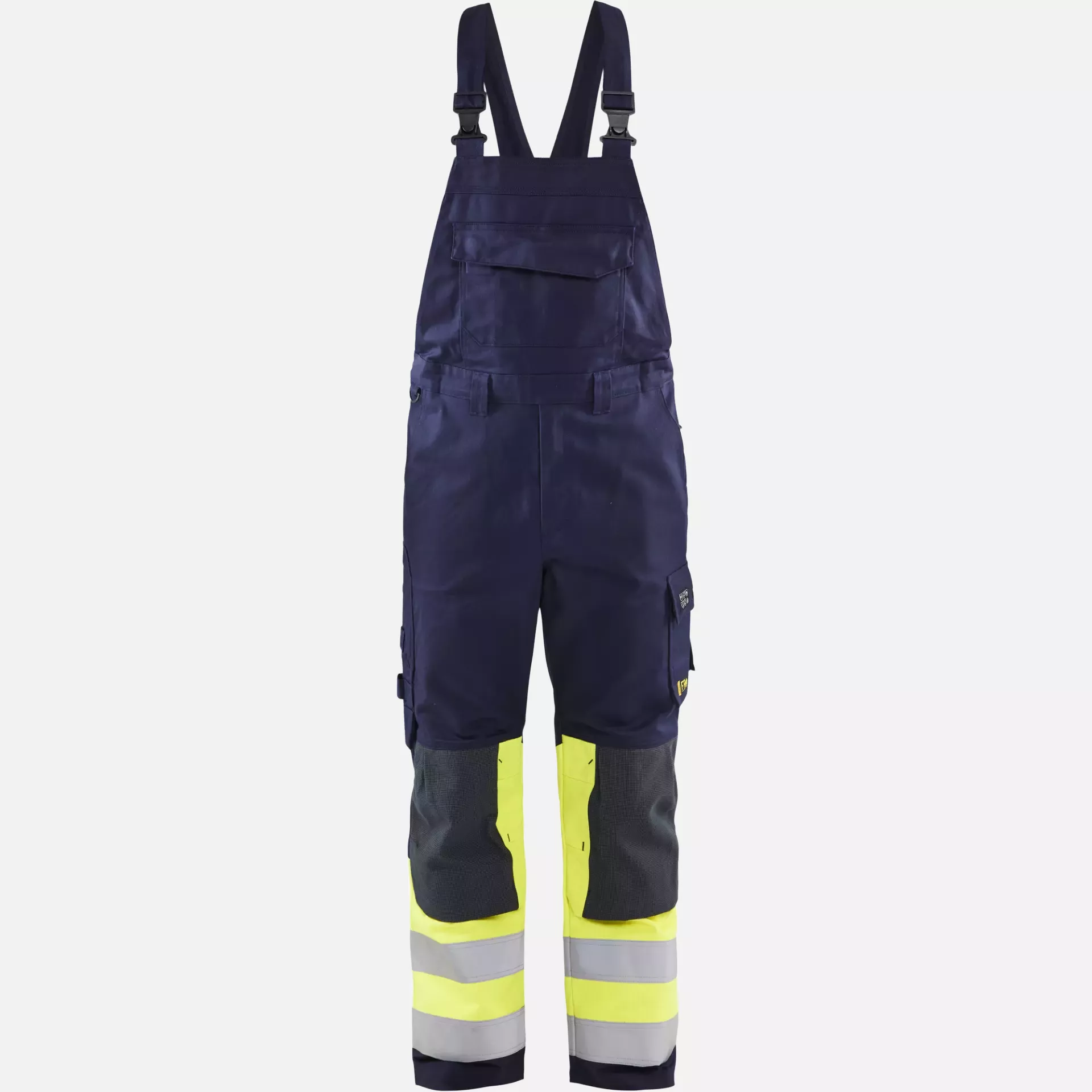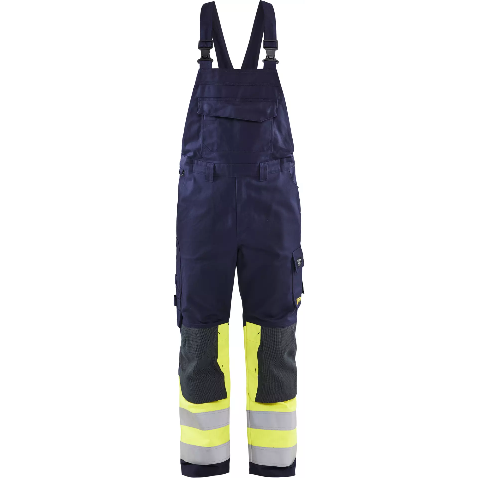 This flame-retardant bib and brace offers maximum protection for work in harsh environments thanks to its oil, dirt, and water-repellent surface and reinforced knee pad pockets made of CORDURA®/Kevlar®/Protal®. With anti-static properties and comprehensive safety certifications including arc protection (ATPV: 11.0 cal/cm²), it is designed for demanding industrial applications. The trousers feature intelligent pocket solutions, adjustable braces, and are tested for industrial laundry.