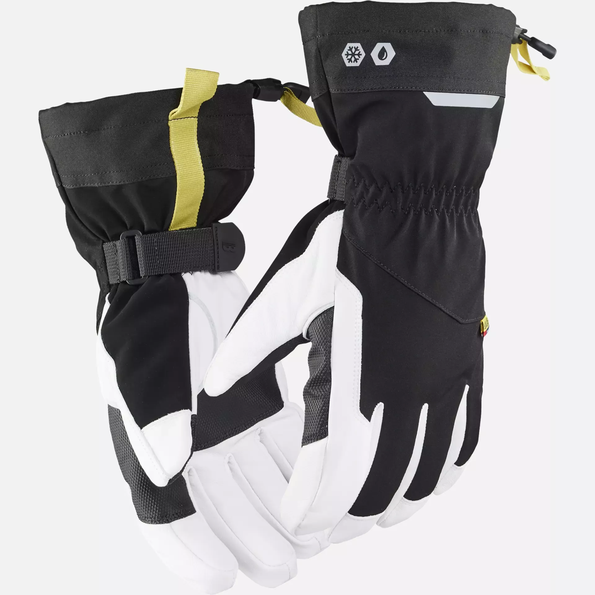 Lined and waterproof work glove made of soft goatskin with a reinforced palm for increased durability. The 150g Thinsulate lining and waterproof membrane offer optimal protection in cold and wet working conditions. The long cuff with Velcro fastener, snow lock, and wrist strap allow for individual adjustment and practical handling during various work tasks.