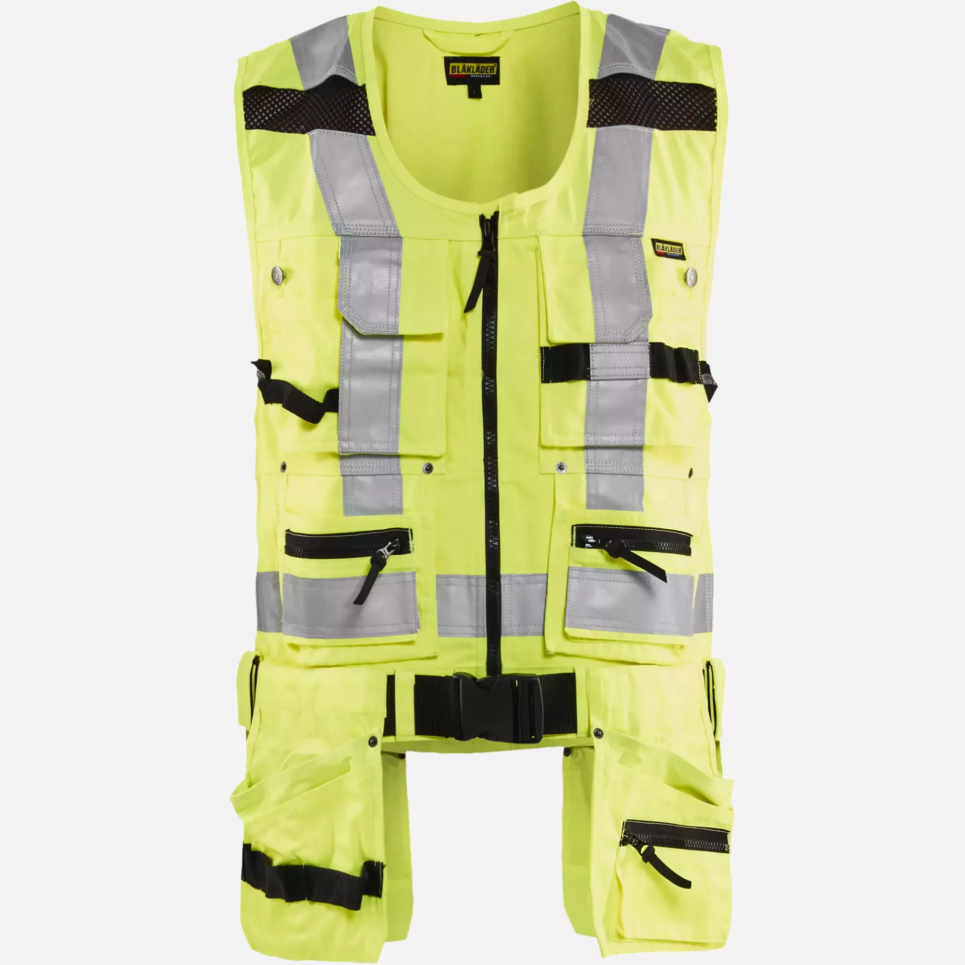 This craftsman vest offers comprehensive functionality with numerous practical pockets for tools and accessories. The detachable nail pockets and the waist belt reduce strain on the shoulders and neck, while double zippers at the front allow for individual width adjustment. Mesh inserts with stretch material ensure lightness and optimal ventilation, while the EN ISO 20471 certification guarantees visibility and safety.