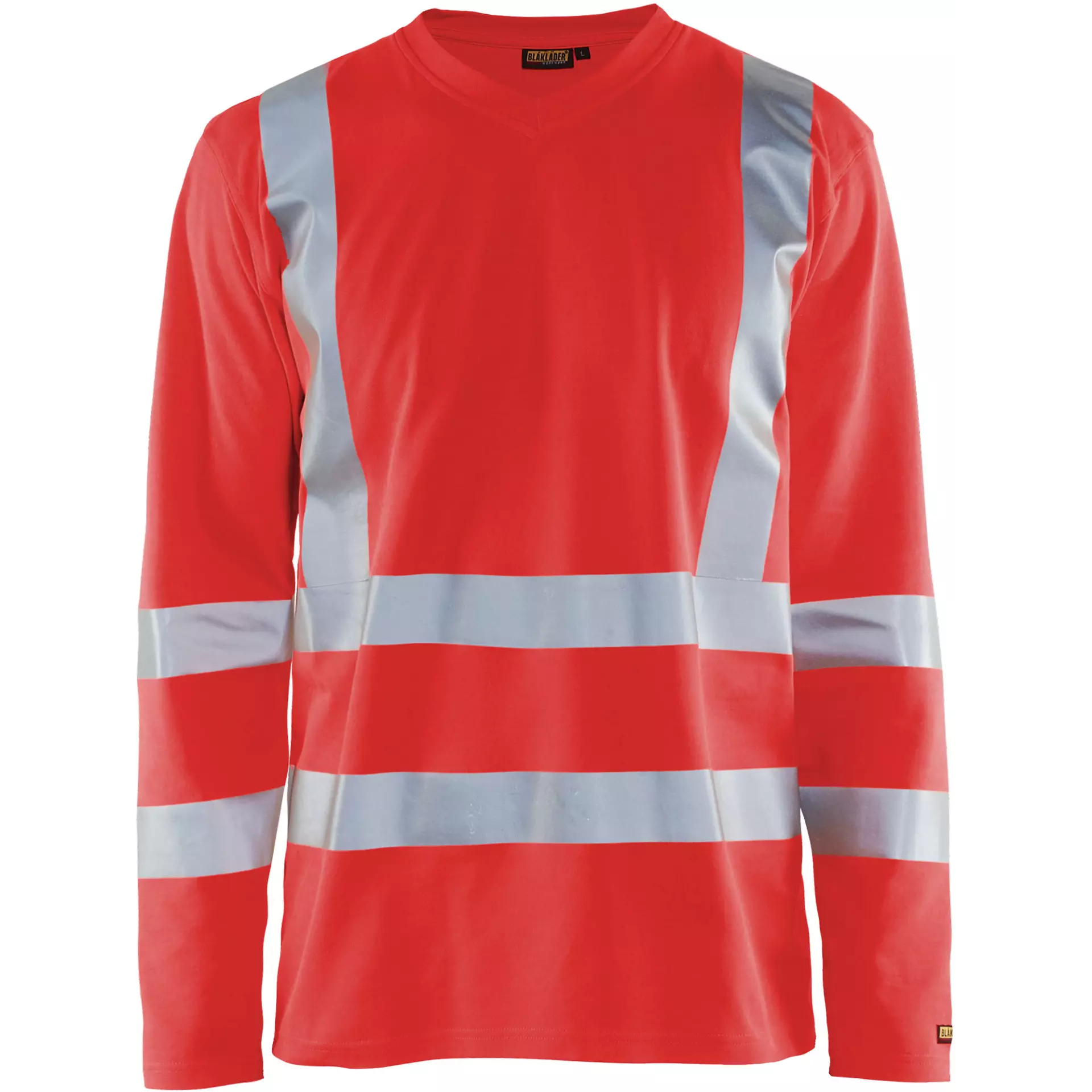 Long-Sleeve High-Vis T-Shirt with V-neck and flexible reflective tape made from an innovative material mix with cotton on the inside and polyester on the outside. This construction ensures maximum wearing comfort and guaranteed odour resistance combined with high Class 3 visibility. The shirt offers UV protection UPF 40+ and is suitable for industrial laundry cycles, making it ideal for demanding work environments.