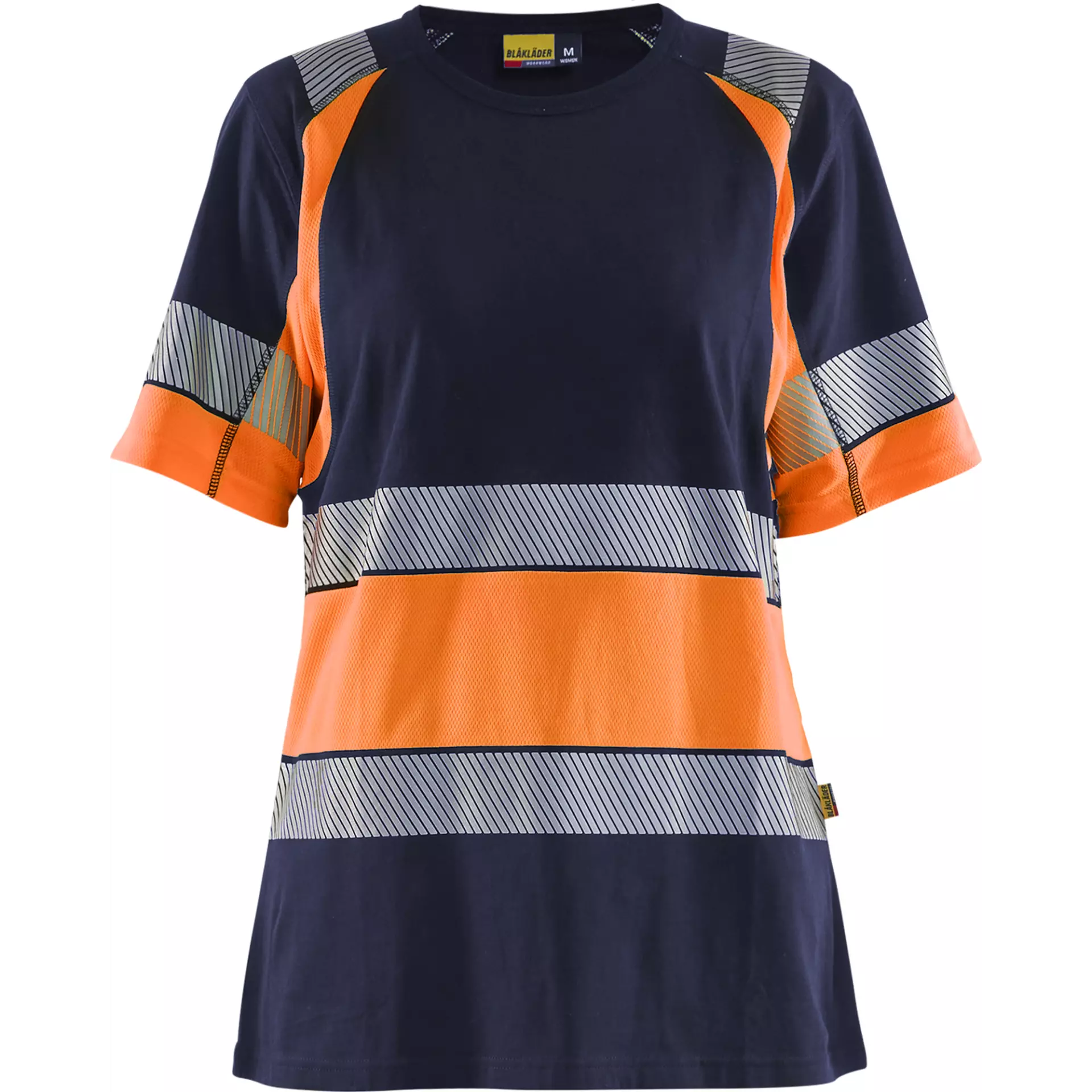 This women's cut High-Vis T-shirt combines cotton comfort with safety features for professional work environments. The 180 g/m² jersey material offers moisture transport and anti-odor properties, while 50 mm wide transfer reflective tape ensures optimal visibility. With EN ISO 20471 Class 1 certification and Oeko-Tex Standard 100, it meets both safety and environmental standards.