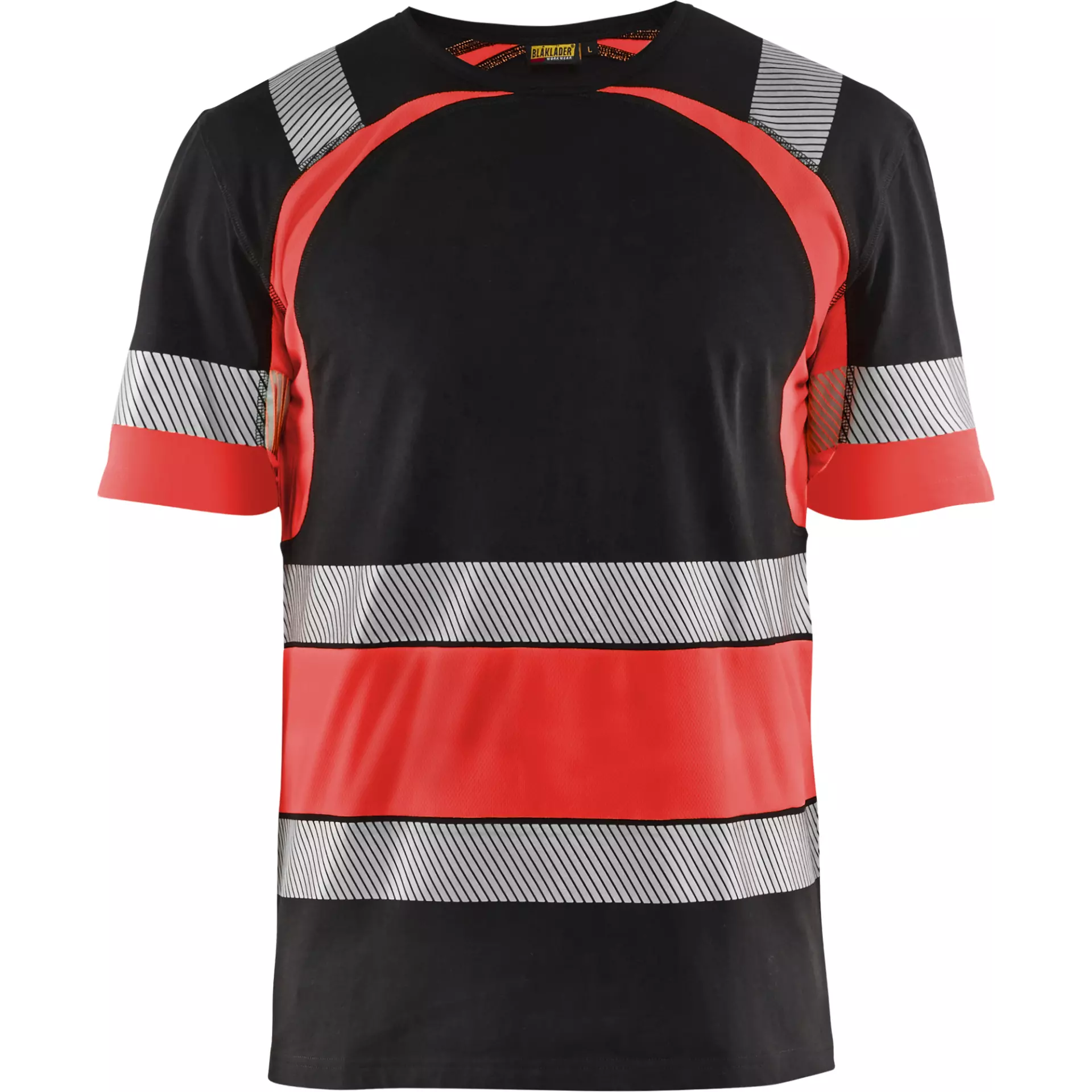 This High-Visibility cotton T-shirt combines comfort with safety through segmented reflective stripes and Hi-Vis inserts made of polyester. The jersey material offers good moisture transport and stretch properties for optimal freedom of movement, while the reinforced neck seam ensures durability. Certified according to EN ISO 20471 Class 1 and Oeko-Tex Standard 100 for professional use in transport, construction, and crafts.