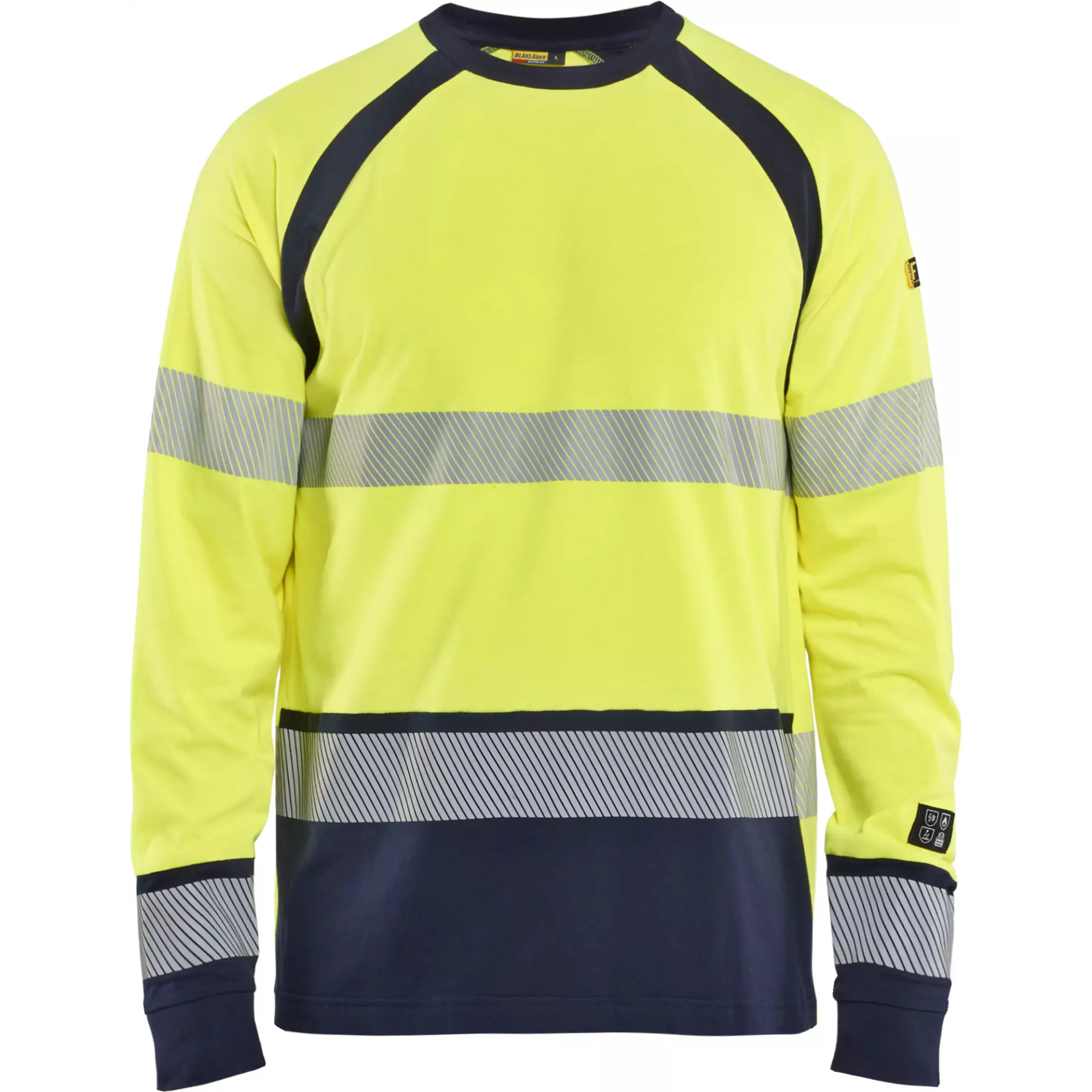Flame-retardant, long-sleeved T-shirt in a high-visibility design for craftsmen, electricians, and service workers. Made from a soft, lighter single jersey fabric (210 g/m²), which is breathable and comfortable to wear yet offers excellent protective properties. With segmented transfer reflective strips for good stretchability and breathability as well as dark colour panels in dirt-exposed areas.