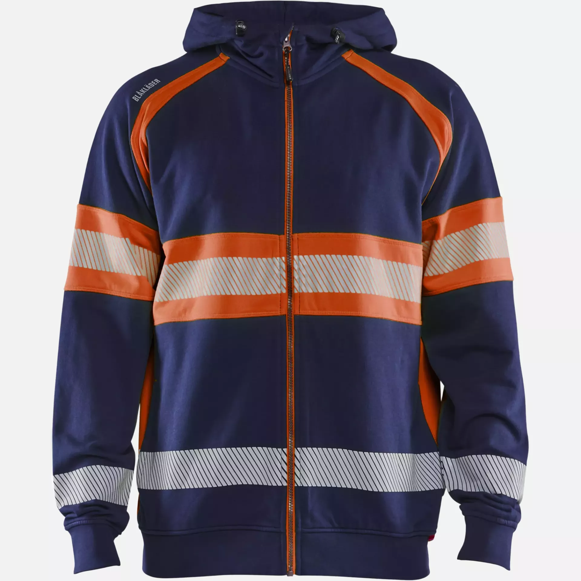 This High Vis hooded jacket combines comfort and safety thanks to its cotton fabric in the dark areas and polyester in the High Vis areas. The segmented reflective stripes offer optimal stretch and breathability, while the robust French Terry construction with a material weight of 320 g/m² ensures durability. With its EN ISO 20471 Class 1 certification and practical features such as an adjustable hood and side pockets, it is ideal for various work environments.