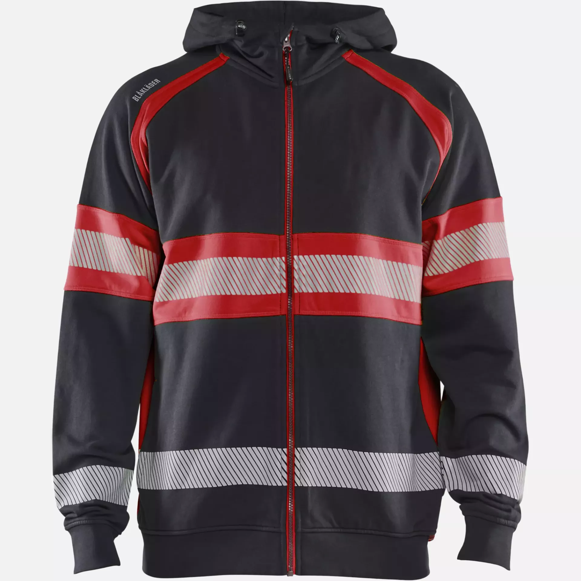 This High Vis hooded jacket combines comfort and safety thanks to the cotton fabric in the dark areas and polyester in the High Vis areas. The segmented reflective strips offer optimal stretch capability and breathability, while the robust French Terry construction with a material weight of 320 g/m² ensures durability. With its EN ISO 20471 Class 1 certification and practical features like an adjustable hood and side pockets, it is ideal for various work environments.