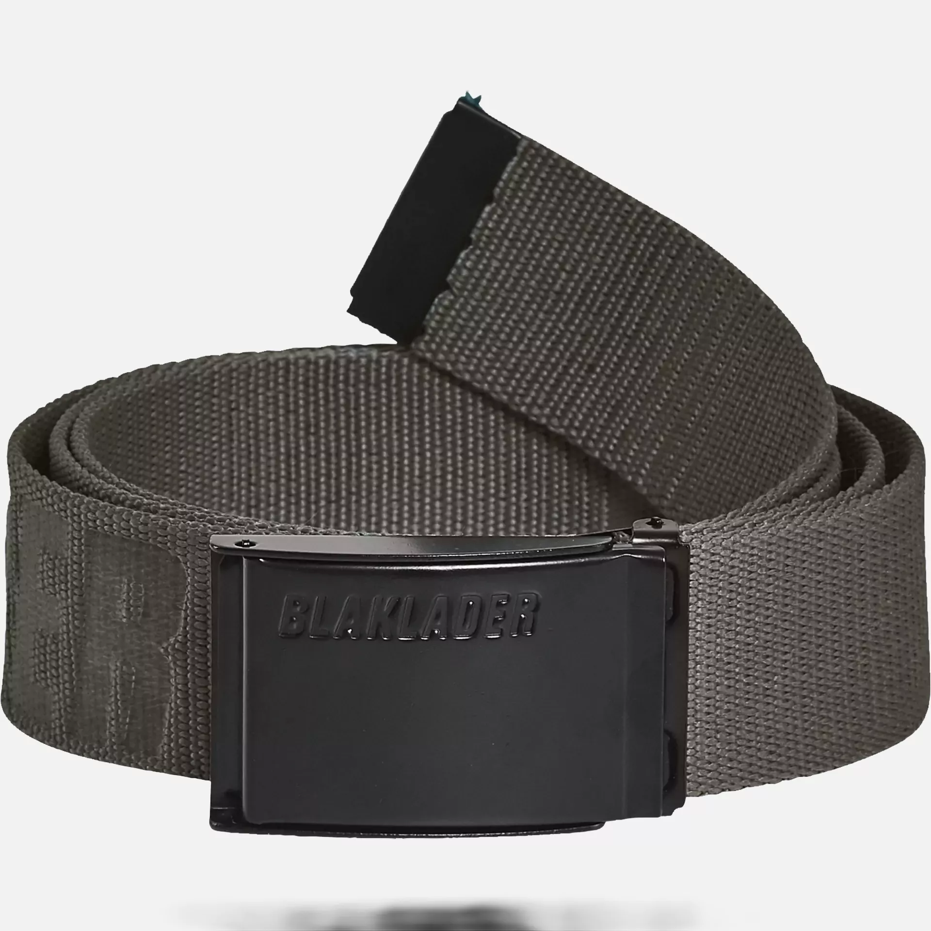 Adjustable textile belt with metal buckle for professional workwear. The nickel-free belt made of 100% polyester offers versatile uses in various professions and is specially designed for craftsmen and workers. The metal buckle features the Blaklader logo and ensures a reliable hold during physically demanding activities.