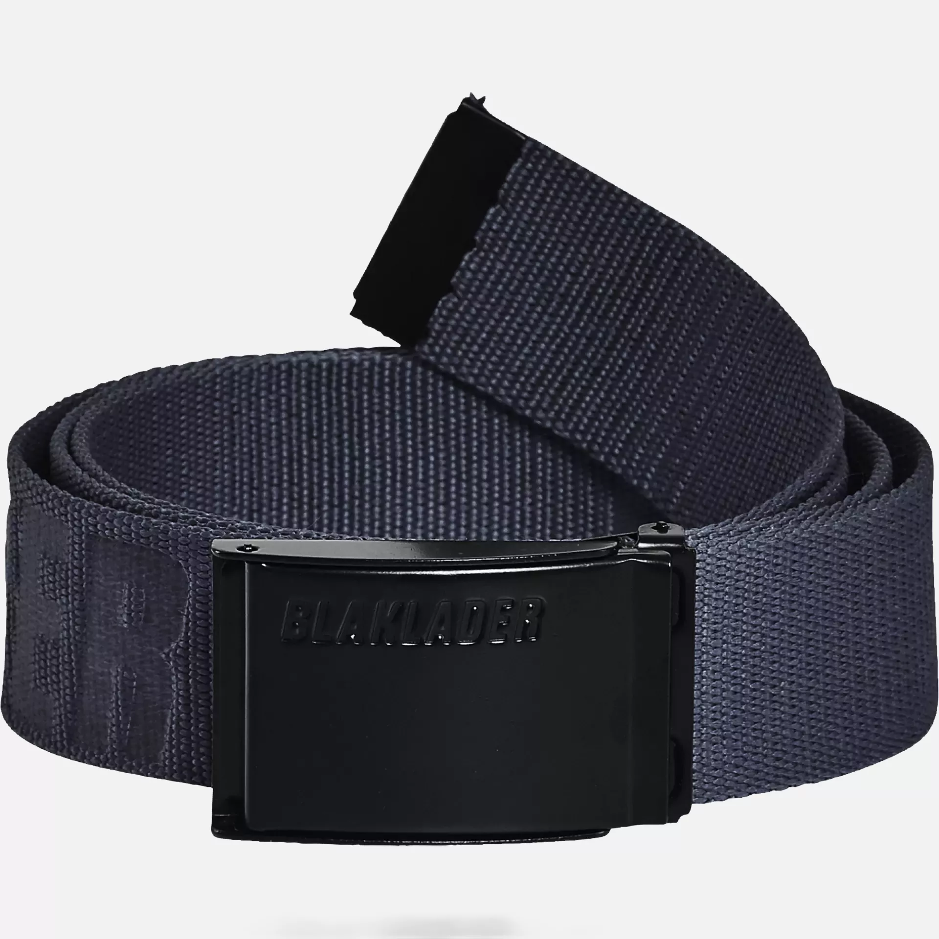 Adjustable textile belt with metal buckle for professional workwear. The nickel-free belt made of 100% polyester offers versatile uses in various professions and is specially designed for craftsmen and workers. The metal buckle features the Blaklader logo and ensures a reliable hold during physically demanding activities.