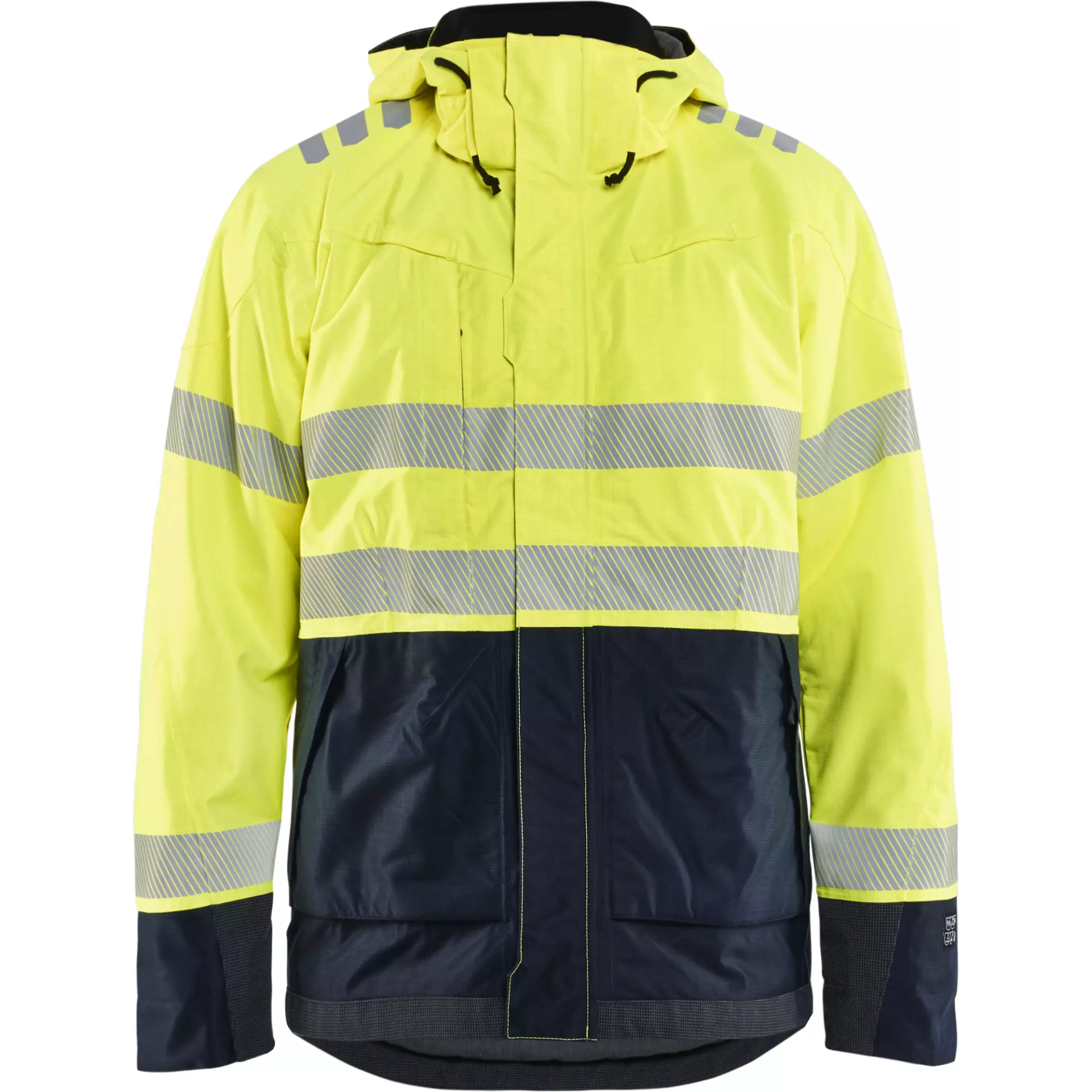 This thin and flexible shell jacket made from inherently flame-retardant material offers wind and waterproof protection without polyester or metal. The jacket features soft transfer reflective strips, excellent breathability, and dark panels in exposed areas for optimal protection. With loops for gas and oxygen detectors as well as a helmet-compatible hood, it is specially developed for demanding work environments.