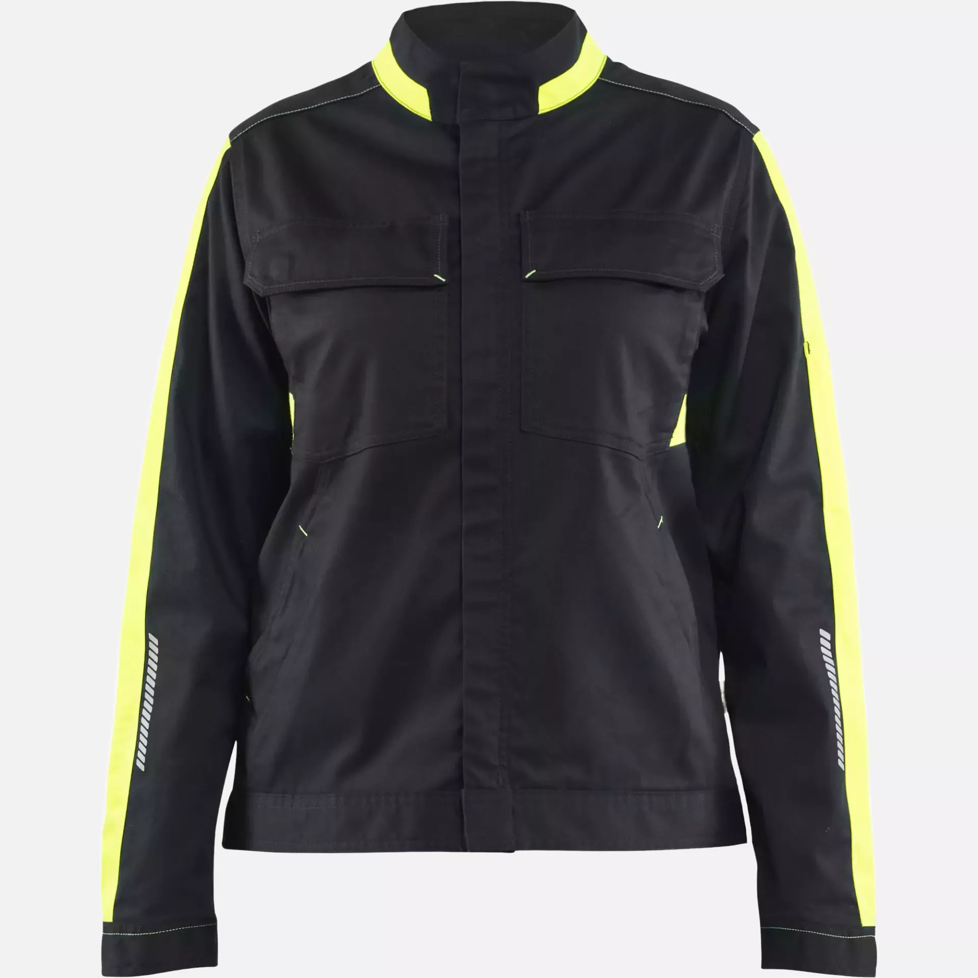 This industrial jacket in women's fit from the Stretch collection by Blaklader offers optimal comfort through flexible 2-way stretch material and scratch-free properties. The jacket is specially suitable for industrial laundry and features reflective details for increased visibility. With pre-bent sleeves, adjustable elements, and practical pockets, it is ideally designed for tradespeople, mechanics, cleaners, and warehouse workers.