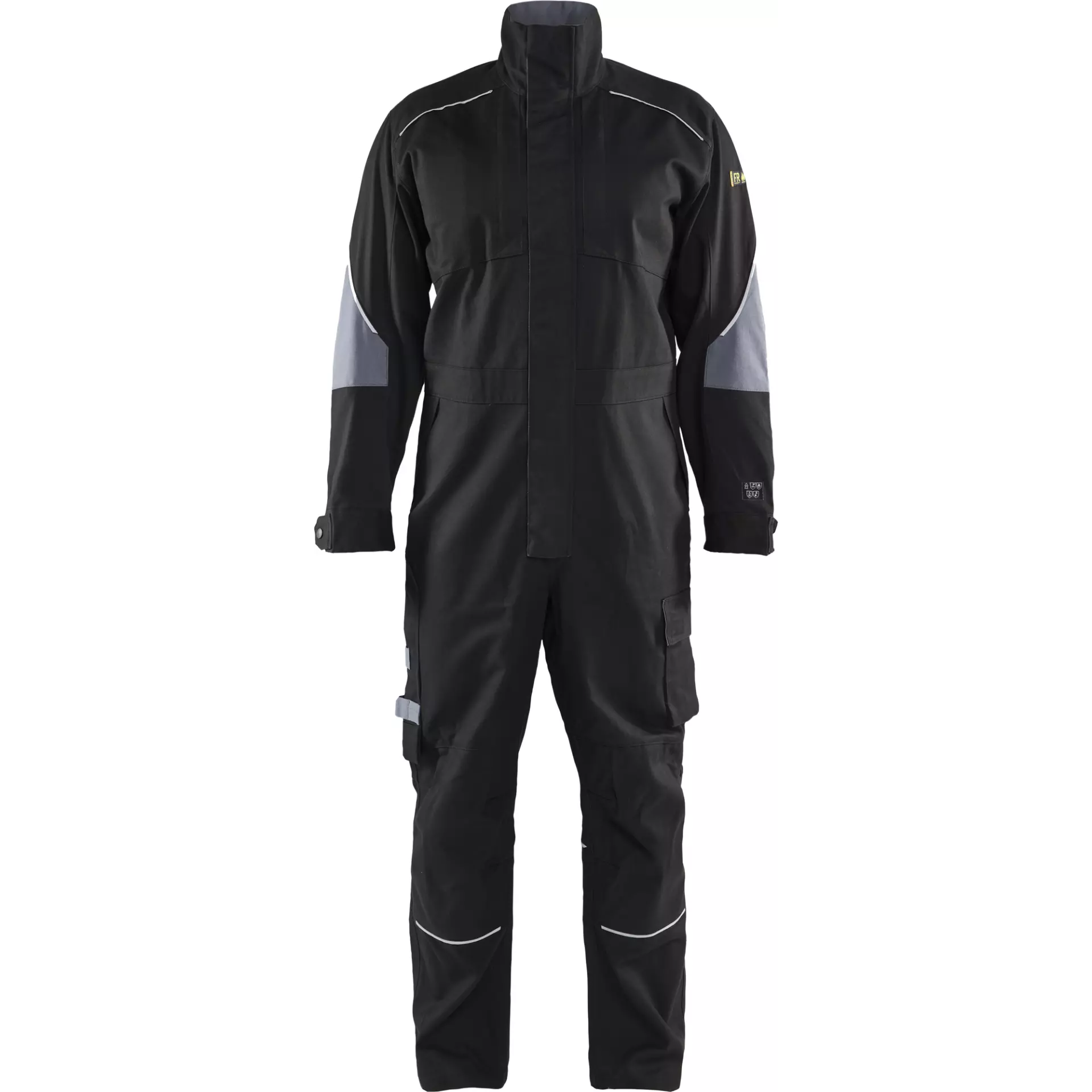 Flame-resistant coverall with oil, dirt and water-repellent surface, designed for craftsmen, electricians and welders. The coverall offers comprehensive protection with an arc flash resistance of 16.0 cal/cm² and features numerous practical pockets and a concealed metal zipper. Action pleats on the back and pre-shaped elbows ensure enhanced wearing comfort, while reflective details improve visibility.