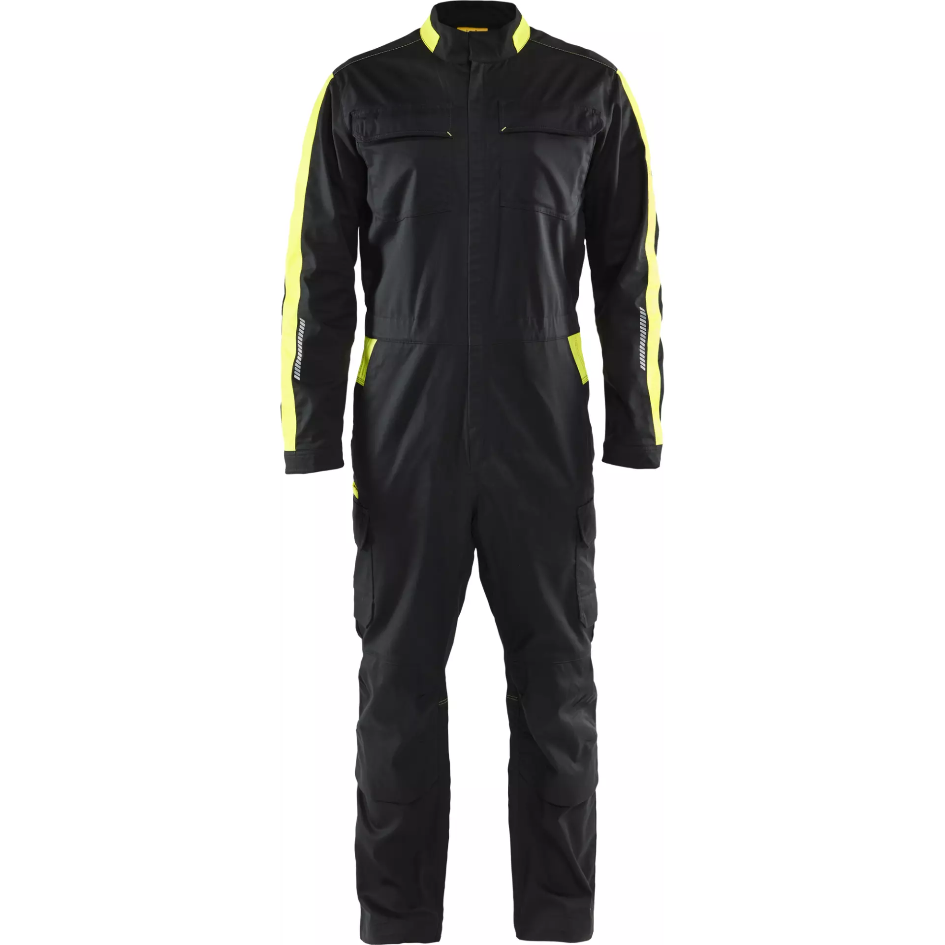 This flexible coverall made of 2-way stretch material offers optimal comfort and freedom of movement for demanding work environments. The scratch-resistant 260 g/m² twill fabric made of 63% polyester, 33% cotton, and 4% elastofin is suitable for industrial laundry and meets OEKO-TEX standards. With reflective details on sleeves and legs as well as ergonomically shaped trouser legs and pre-formed sleeves, it is ideal for warehouse workers, mechanics, cleaners, and tradesmen.