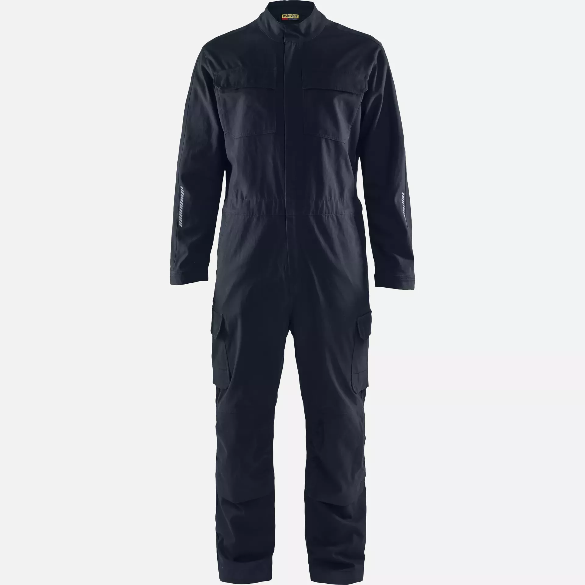 Flexible coverall made of cotton canvas with 2-way stretch technology for optimal freedom of movement and comfort. The scratch-free material is industrially washable and features reflective details for increased visibility. With extensive pockets and an ergonomic fit, this coverall is ideal for various work environments in industry and service.