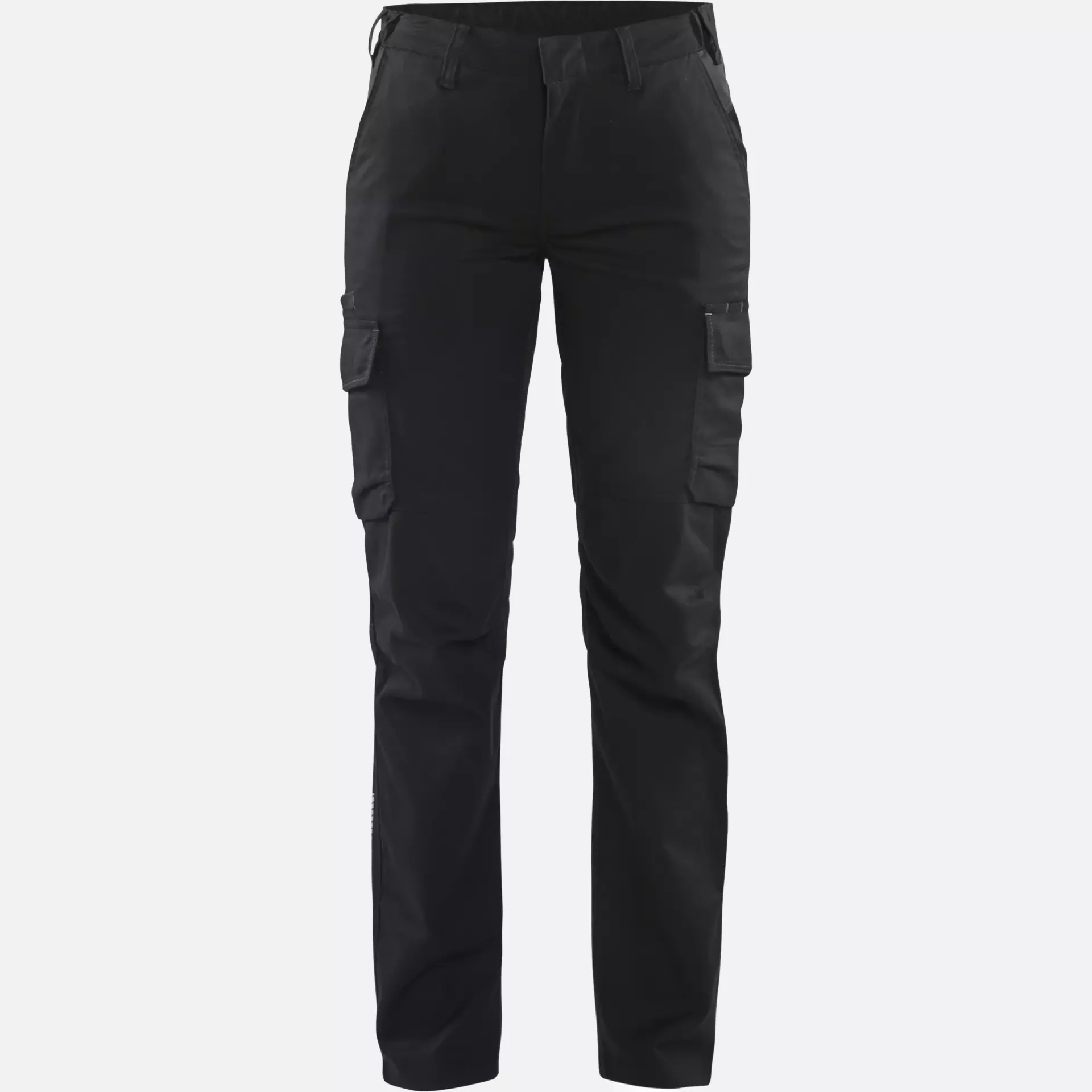 These women's work trousers from the Blaklader Industry collection offer optimal wearing comfort for demanding work environments thanks to their full 2-way stretch material and elastic waistband. The scratch-resistant trousers are suitable for industrial laundry and feature practical details such as concealed metal buttons, an internal ruler pocket, and reflective elements for additional visibility. With their ergonomic fit and pre-bent legs, they are particularly suitable for warehouse, cleaning, mechanical, and trade work.