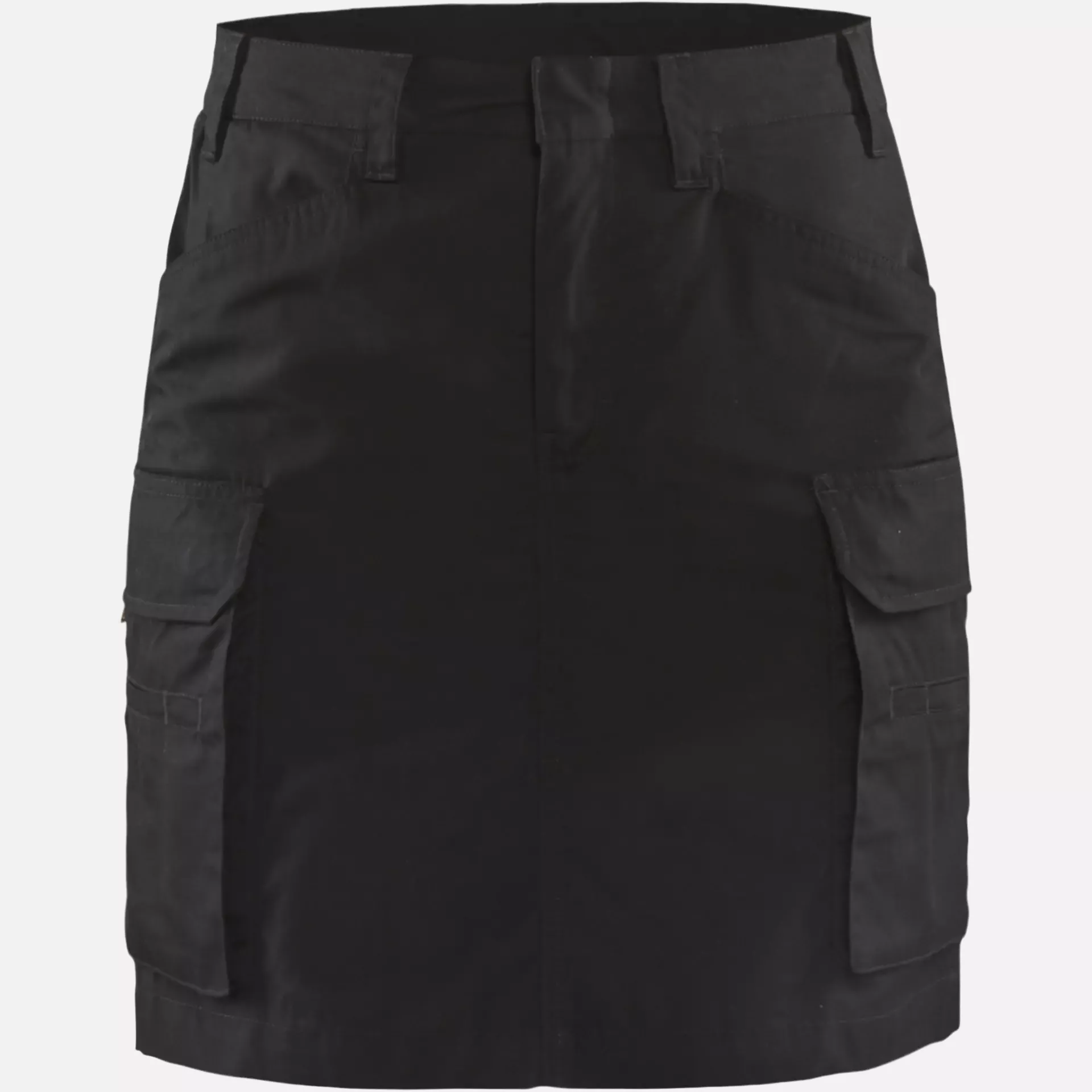 Scratch-resistant skirt for service and industrial work with integrated mesh inner shorts for maximum freedom of movement. The 4-way stretch material on the back and the elastic waistband ensure all-day comfort, while magnetic closures on pocket flaps allow for practical use. The skirt reaches just above the knee and is specifically designed for women in various professions.