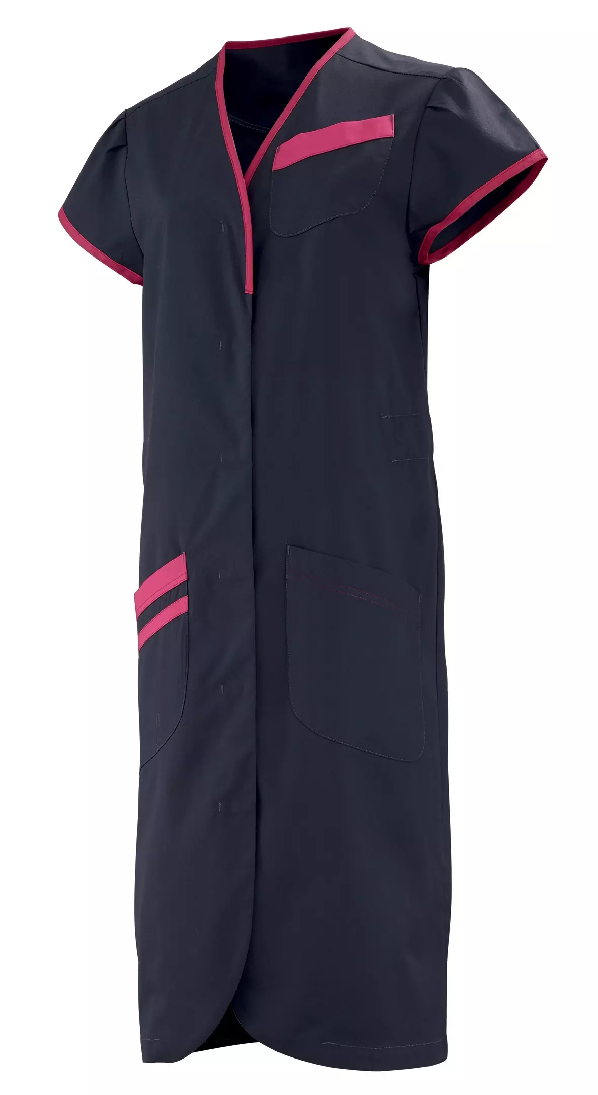 This functional short-sleeved store coat offers practical features for professional use. With its V-neck, concealed snap fasteners, and well-designed pocket details, it combines functionality with comfort. The contrasting elements and elastic waist ensure comfortable wear and a professional appearance throughout the workday.