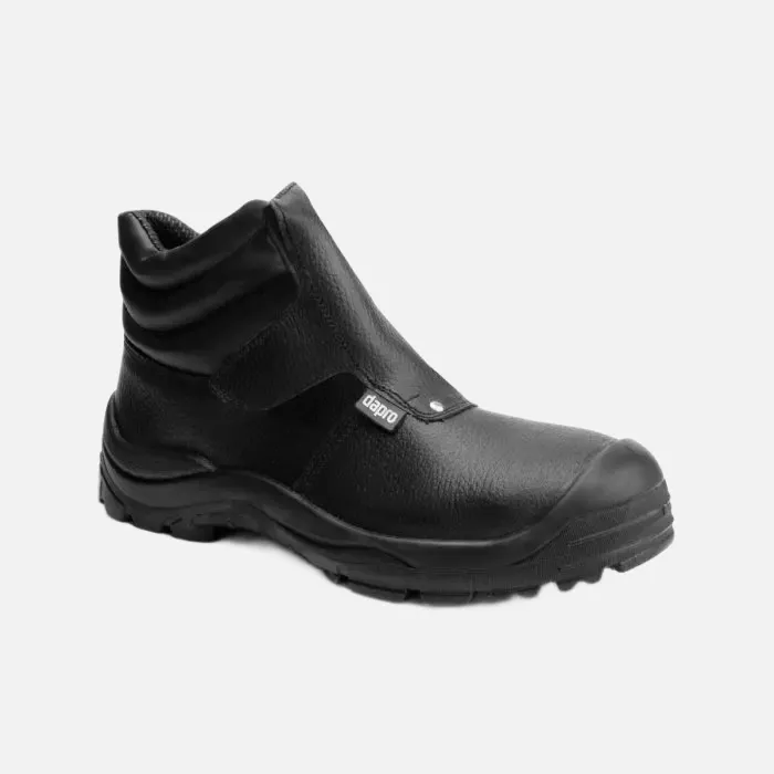 These professional safety boots combine water-resistant leather construction with comprehensive protection features including a steel toe cap and anti-perforation mid plate. The innovative PU/PU lightweight sole design provides exceptional comfort while offering oil and slip resistance, along with heat protection up to 160°C. A protective leather flap with hook-and-loop closure offers additional protection against welding sparks, making these boots ideal for demanding industrial environments.