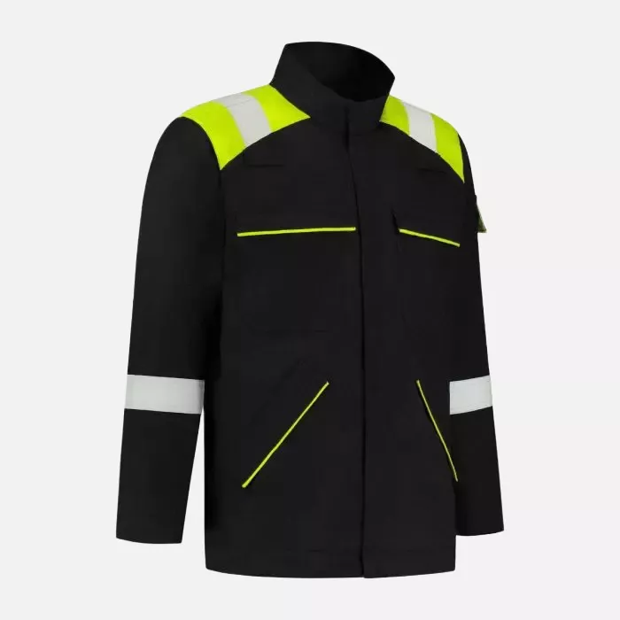 This advanced protective jacket combines multiple safety features with ergonomic design, offering comprehensive protection against various workplace hazards. The garment features a high protective collar and YKK® concealed zipper system with hook-and-loop closure for enhanced weather protection. Constructed from 99% Guardian fabric with 1% anti-static material and chemical-proof finish, this jacket delivers superior protection while maintaining comfort and functionality.
