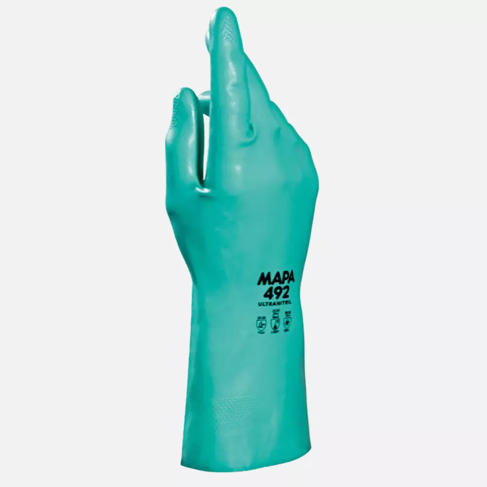 Norm: En 388, En 374, Cat. 3 Material: Nitrile, Greenflocklining: 100% Cotton thickness: Approx. 0,38 mm Length: Approx. 32 Cm Sizes: 6, 7, 8, 9, 10, 11 Premium Quality • Velourized Inside • Additonal Layer Of White Nitrile Inside • Palm With Grip Pattern