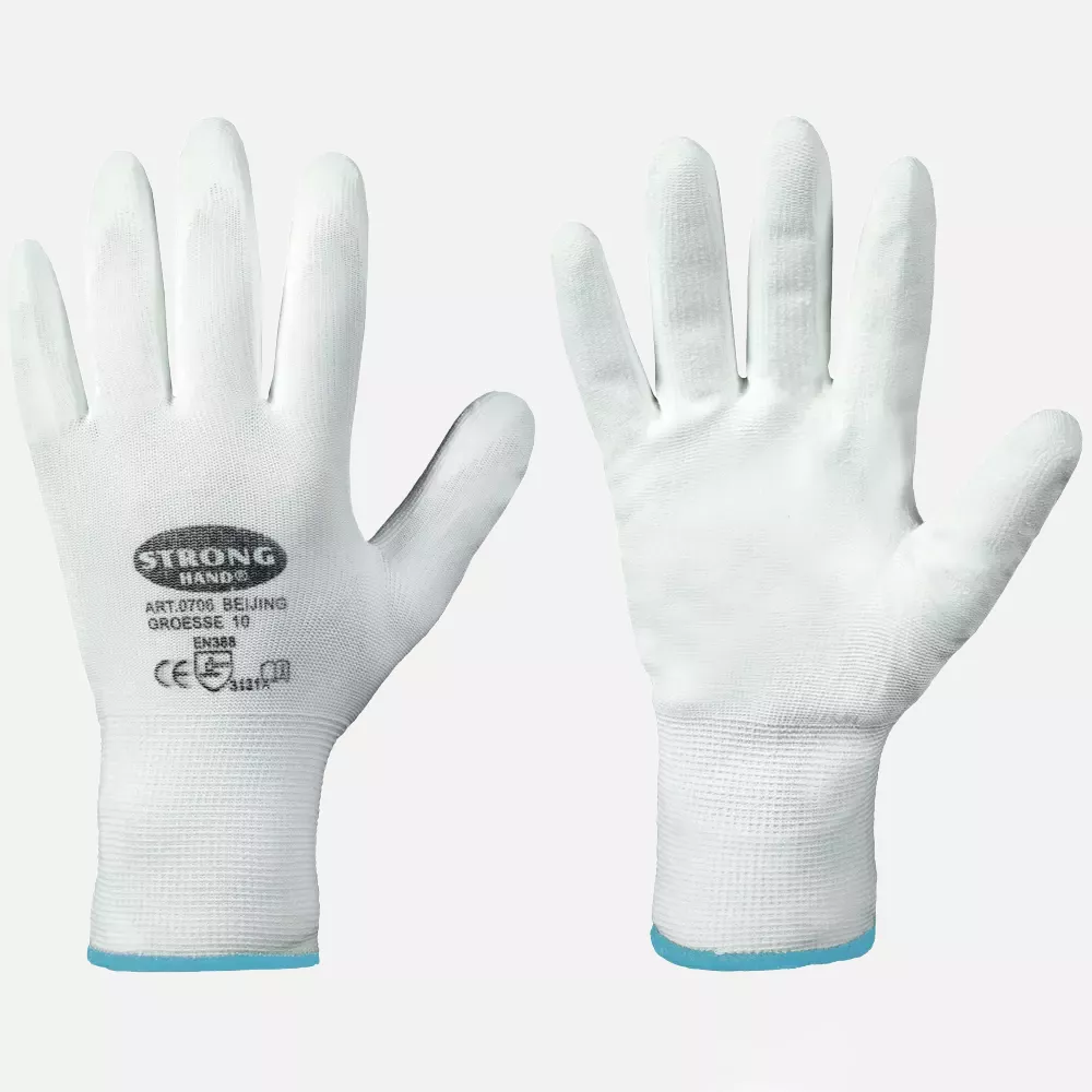 Norm: En 388 Liner: 100 % Polyamide, White coating: Polyurethane, White Sizes: 6, 7, 8, 9, 10, 11 Seamless Knitted / 13 G • Polyurethane Palm coating • Very Good Fit • Secure Grip
