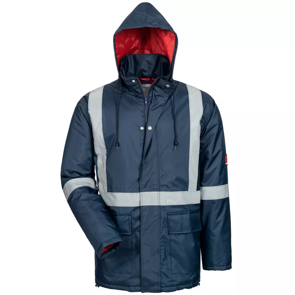 Fabric Composition: 100% Polyester, Pu coatingpadding: 100% Polyesterlining: 100% Polyester Colour: Shell Fabric: Navylining: Red Size: S–Xxxl Wind And Waterproof • Taped Seams • Reflective Stripes Around The Body And Sleeves • Padded Lining