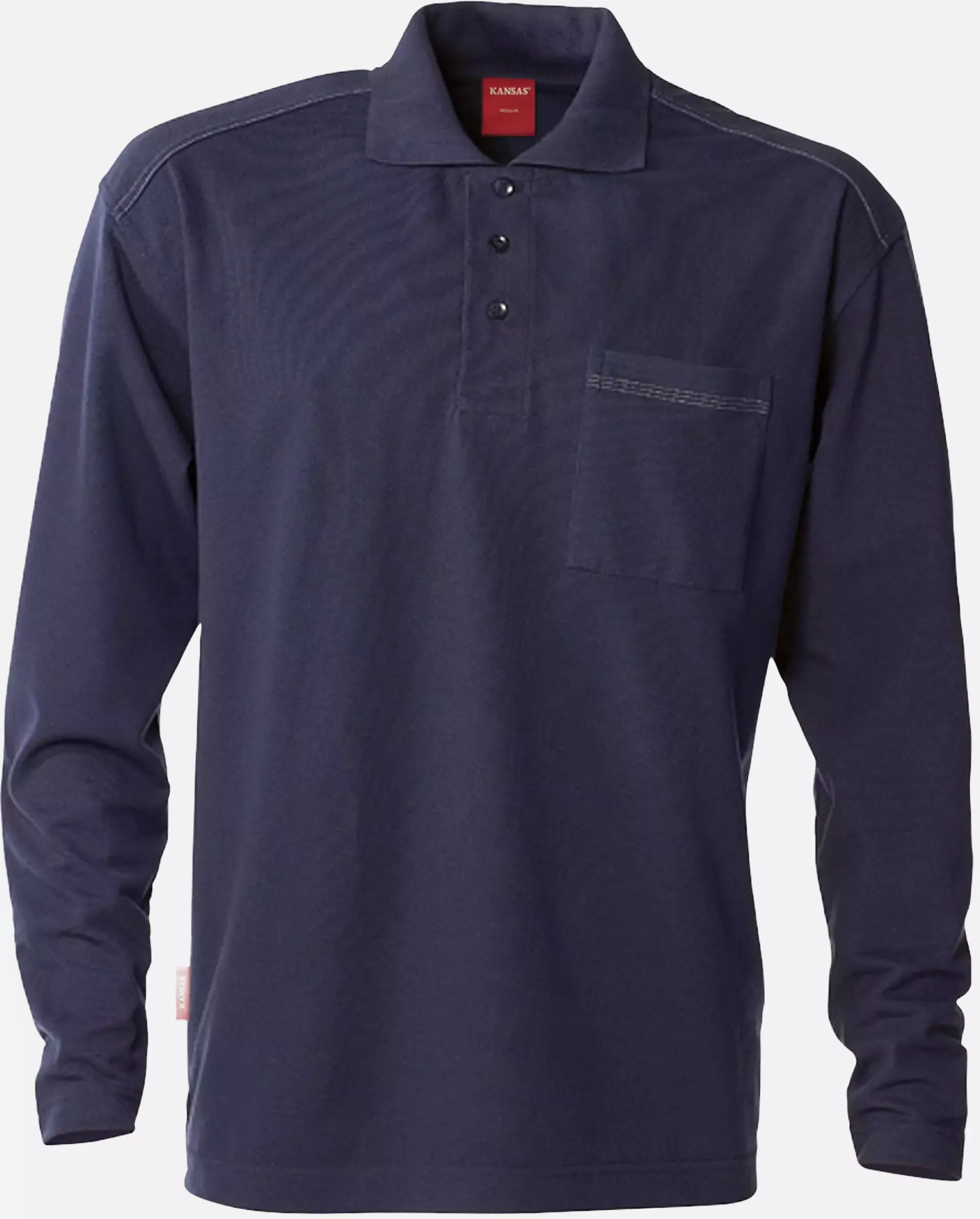 Long-sleeved polo shirt for industrial applications with colorfast finish and practical chest pocket. The shirt features a classic 3-button placket and is suitable for professional industrial laundry according to ISO 15797. OEKO-TEX® certification guarantees textile quality tested for harmful substances.
