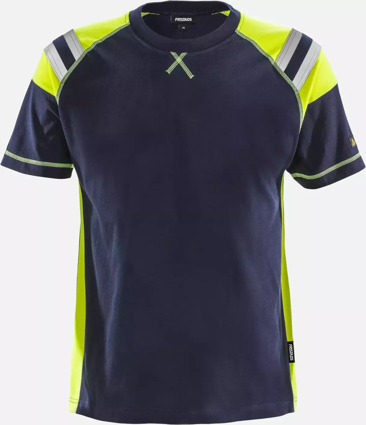 Flame-retardant T-shirt with anti-static properties for industrial use as an undergarment. The 230 g/m² shirt features reflective details on the shoulders and a rib-knit neck for enhanced comfort. It is designed to be combined with EN ISO 11612 clothing and complies with multiple safety standards.