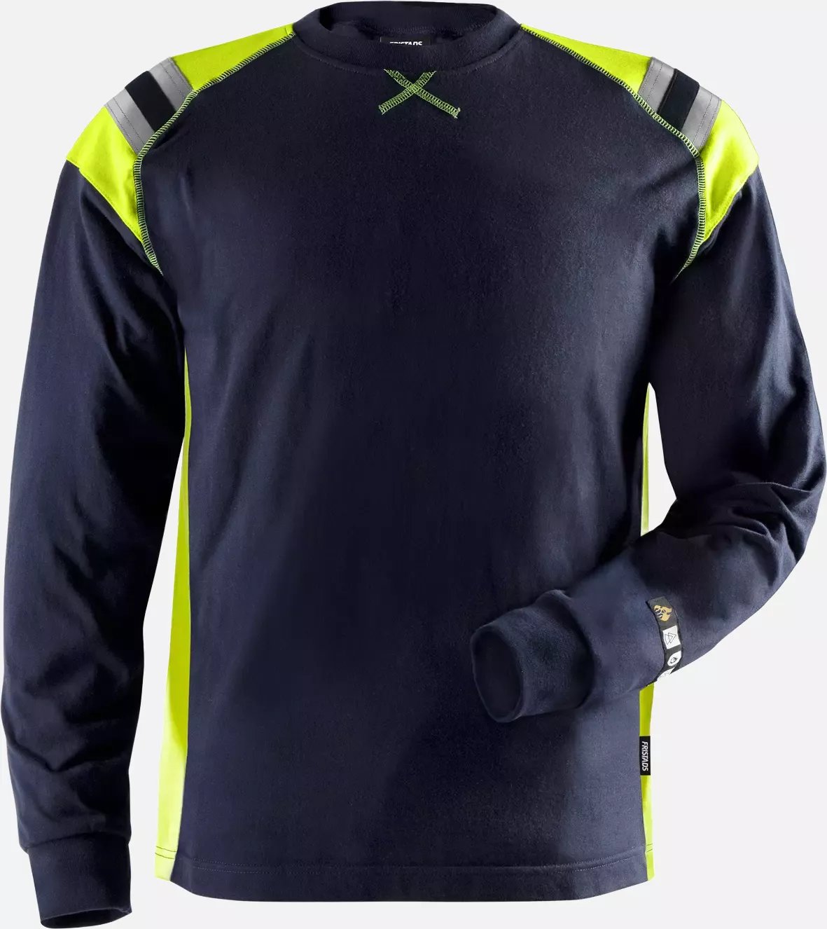 Long-sleeved Flamestat T-shirt with reflective strips over the shoulders and rib-knit cuffs for optimal comfort. The 230 g/m² shirt meets several safety standards including electric arc protection and anti-static properties. Tested after 25 washes and suitable for industrial laundry, it offers reliable protection for year-round use.