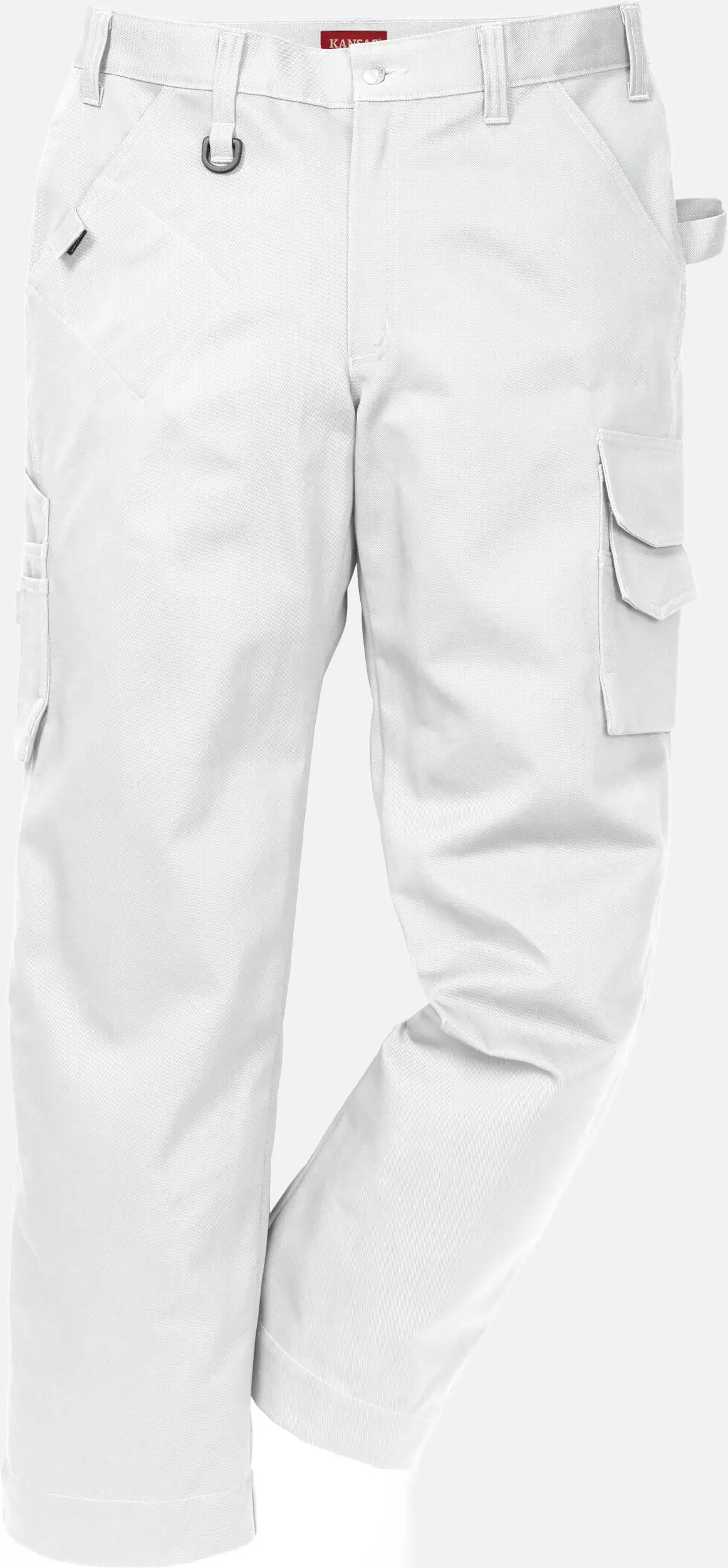 These cotton work trousers offer optimal wearing comfort for industrial applications thanks to their sophisticated construction with triple-needle fell seams and saddle cut. The extensive pocket configuration with special features such as mobile phone pockets, pen pockets, and an integrated microchip pocket in the waistband makes them ideal for service activities. With adjustable leg length and suitability for industrial laundry according to ISO 15797, they meet professional requirements.