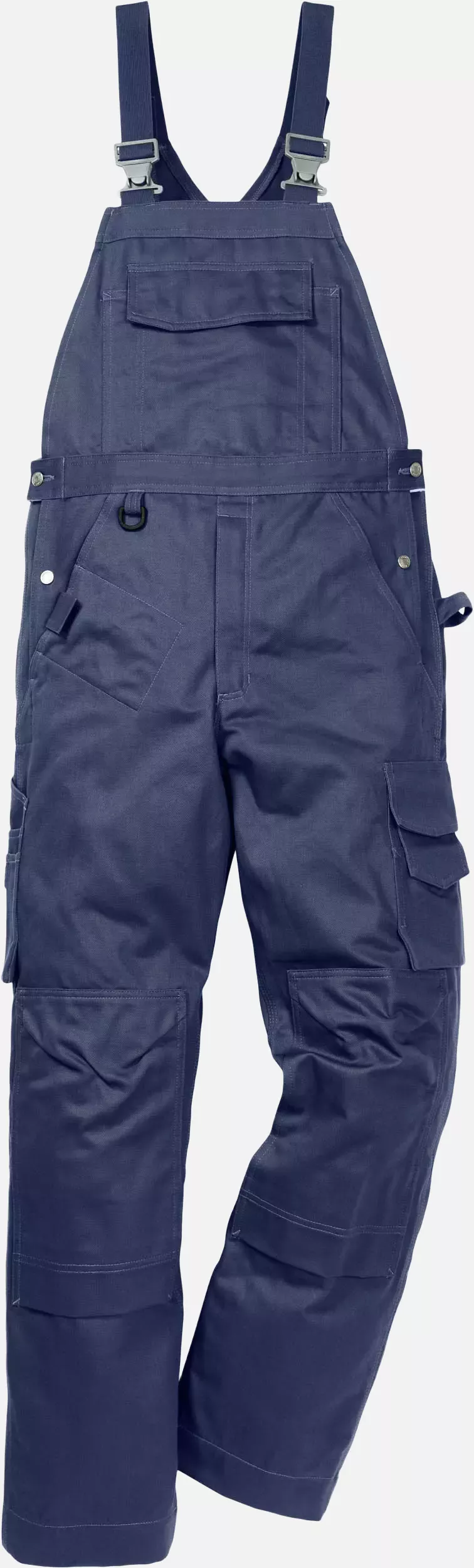 This cotton bib overall offers optimal wearing comfort for industrial applications thanks to its sophisticated construction with triple-stitched seams and a diagonally cut back section. The extensive pocket configuration with knee pockets, various leg pockets, and practical details like hammer loops makes it the ideal workwear for trade activities. With an adjustable waistband and customizable leg length, it ensures an individual fit, while certification according to EN 14404 and suitability for industrial laundering meet professional standards.