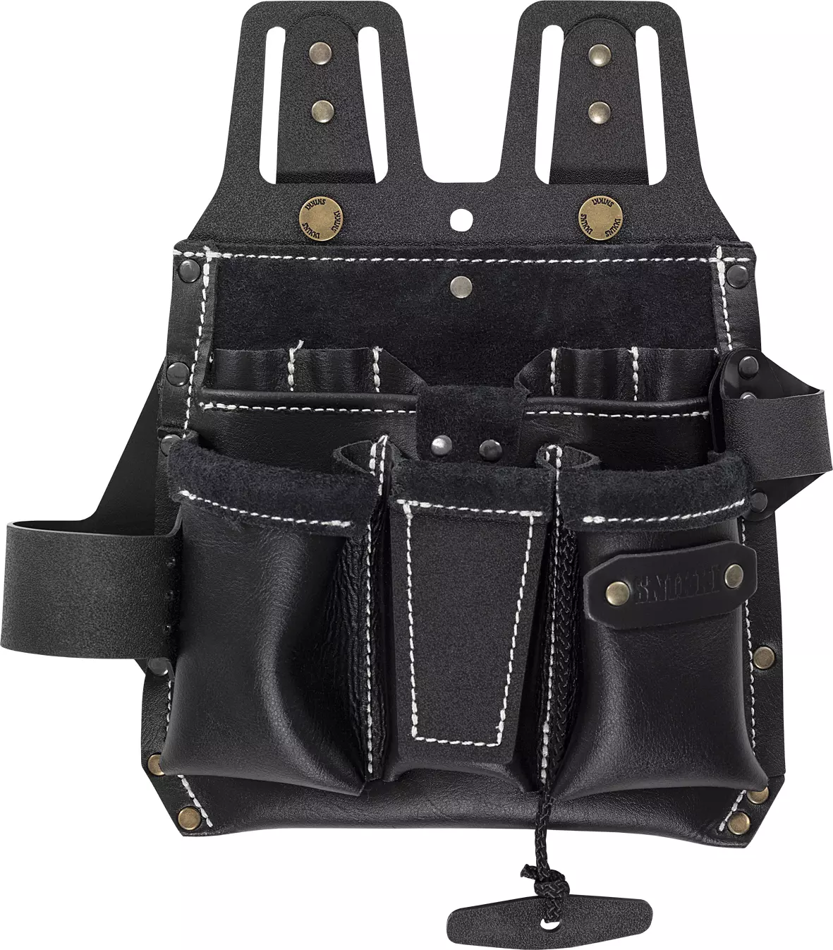 Robust tool holder made of particularly resistant leather, specially developed for electricians. With a total of 10 pockets and holders, it offers optimal organization for various tools and accessories. The water-repellent surface and rivet reinforcement ensure durability in daily use.\n\nProduct Features:\n- Particularly robust leather\n- 7 pockets for screwdrivers, pliers, cutters, cutting pliers or a small cordless screwdriver\n- 3 pockets for insulated pliers\n- Tape measure holder\n- Hammer loop\n\nTechnical Details:\n- Utility knife holder\n- With rivet reinforcement\n- Water-repellent\n- Quick-Grip System\n- Made in Sweden\n\nRecommended Application:\n- For electricians
